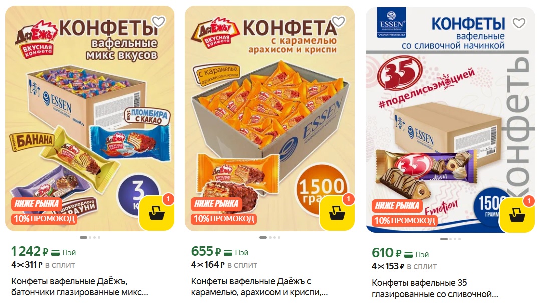 Кондитерские изделия, конфеты, батончики по хорошим ценам с дополнительной скидкой за подписку на магазин.