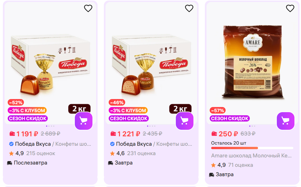 На Wildberries сейчас хорошие цены на сладости «Победа вкуса» при оплате WB кошельком. Вот что попалось: