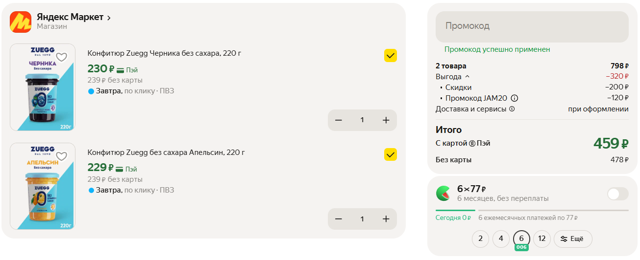 Сейчас действует скидка 20% по промокоду: JAM20 при заказе от 400₽. В составе конфитюров 60% ягод и фруктов, без красителей и консервантов, без глютена. Хороший вариант и на завтрак, и в выпечку, и просто так к чаю. Обрати внимание: есть виды с добавлением сахара.