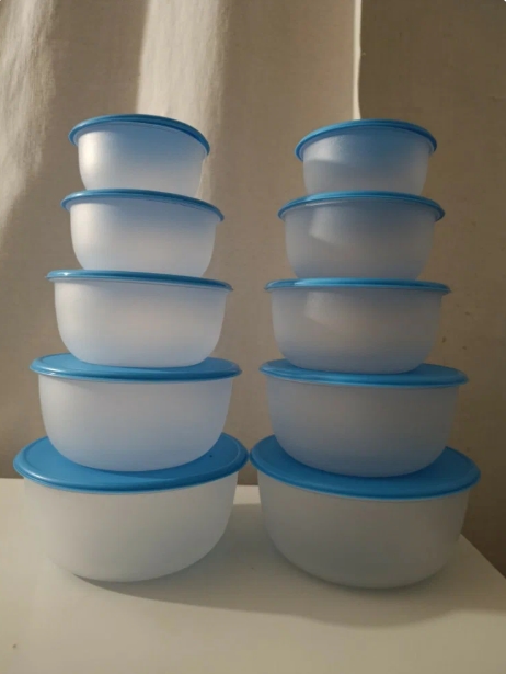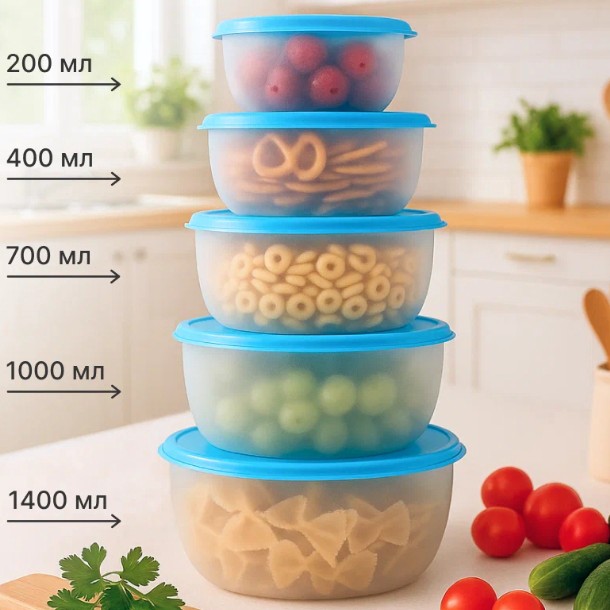 Уже не первый раз беру эти контейнеры, отличные. В наборе пять штук: от 200 мл до 1400 мл - самый большой удобен для супа или салата.