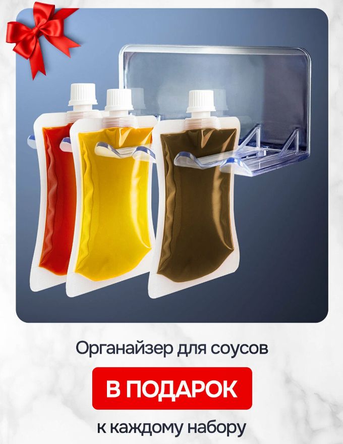 Но если хотите совсем выгодно - берите набор 12 контейнеров за 632₽ (53₽ за штуку) - вот тут. И ещё органайзер для соусов в подарок дают. Я себе такой взяла, теперь порядок на полке.