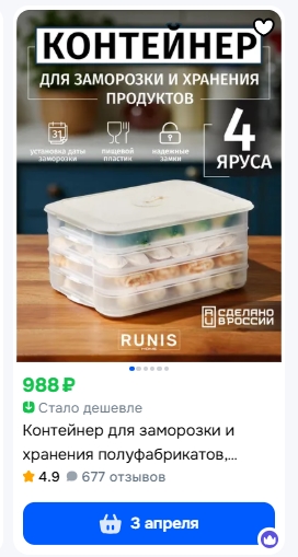 Четыре яруса, можно разобрать и взять сколько нужно. Каждый контейнер размером 30х20 см, высота около 4 см. Рифленое дно - пельмени не примерзают. На крышке можно дату поставить, удобно. Сделано в России.
