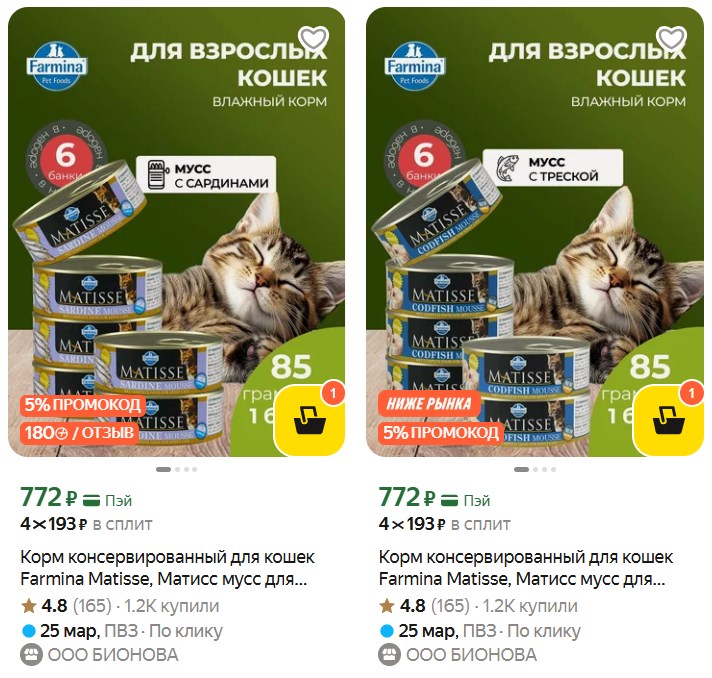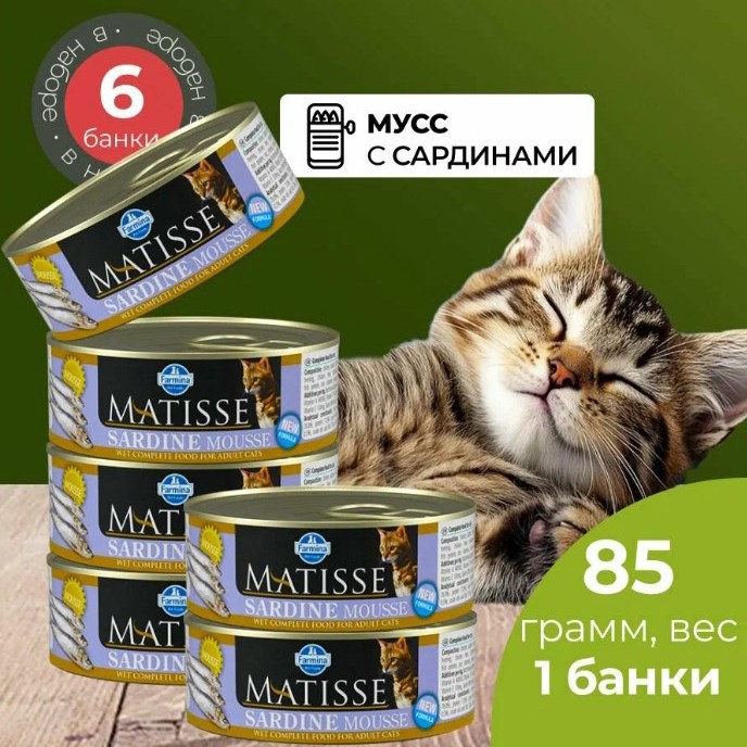 Привет. На Маркете сейчас корм для кошек Farmina Matisse - 733₽ за 6 банок (по 85 г), плюс 180 баллов Плюса за отзыв. Промокод: P5U9BSUA. Варианты: