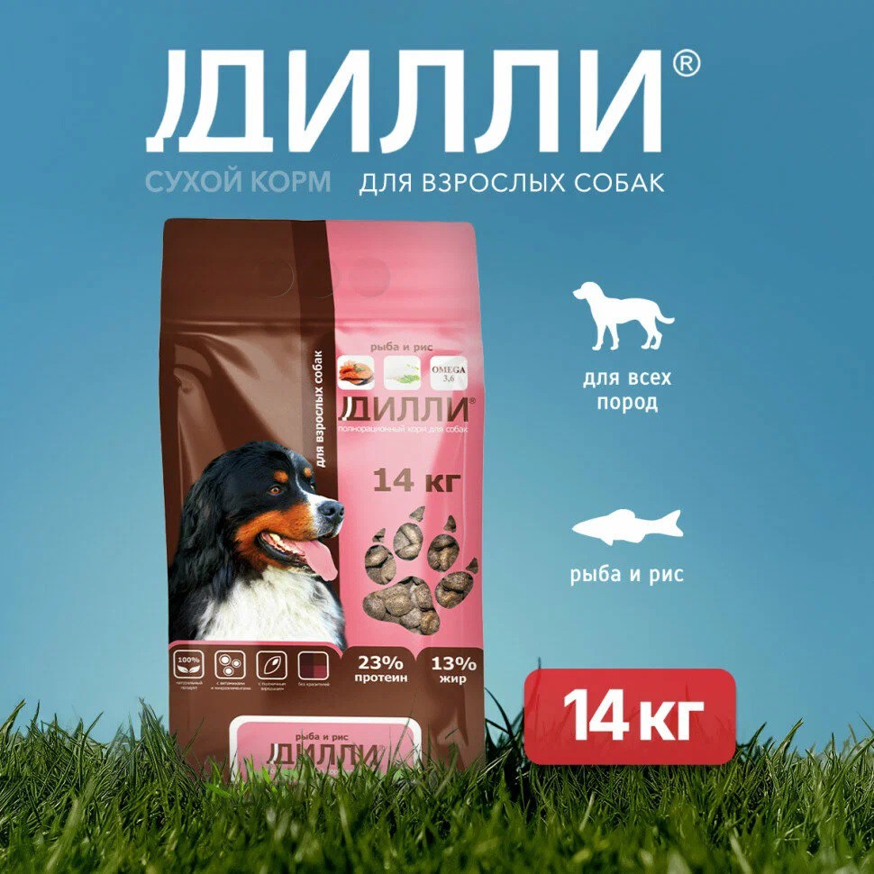 Сухой корм для взрослых собак Дилли, для всех пород, с рыбой и рисом 14 кг за 2097₽