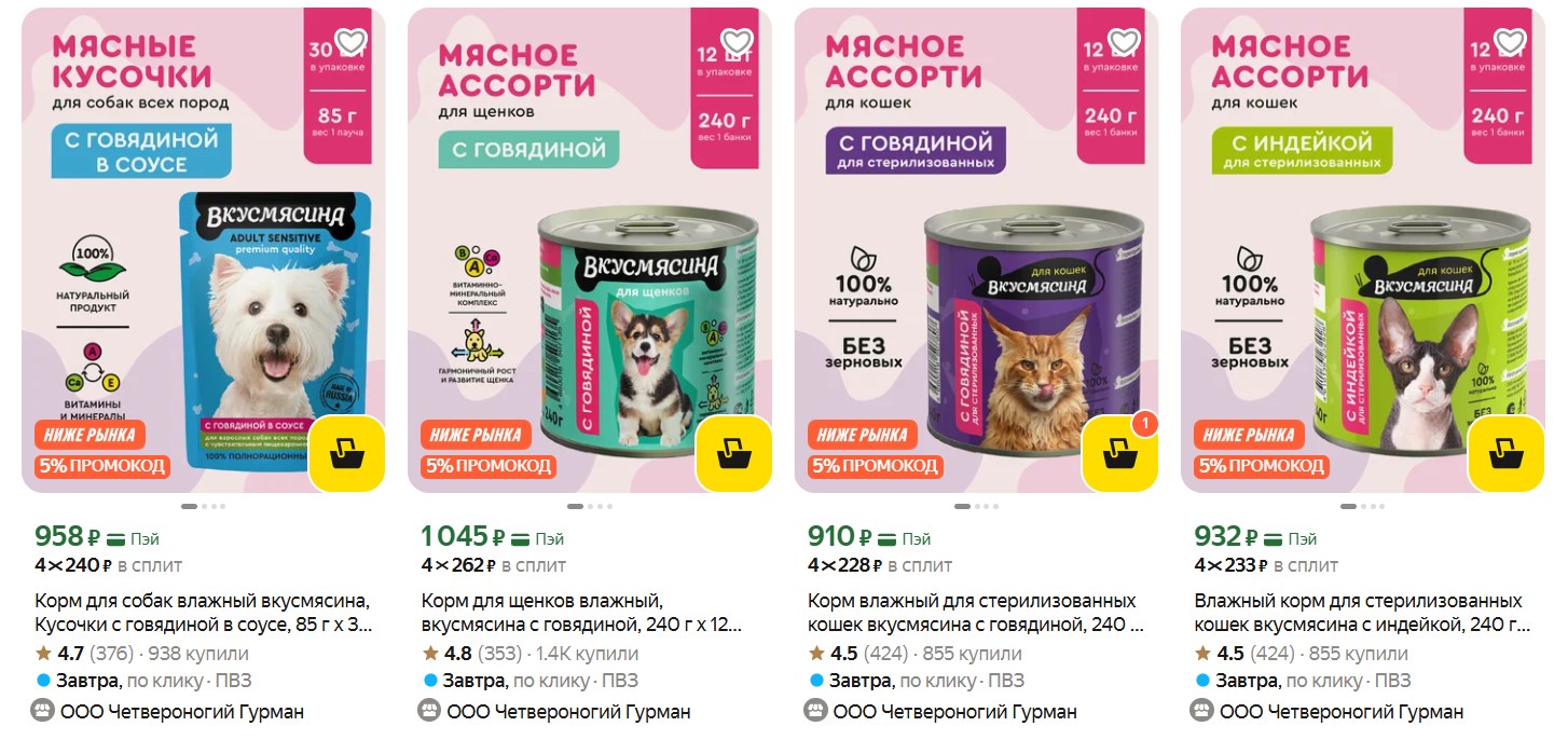 Ребята, у кого дома есть хвостатые - посмотрите корма «Вкусмясина» на Яндекс Маркете. Цены и так приятные, а промокод даёт ещё 5% сверху. Можно закупиться сразу пачками на месяц.