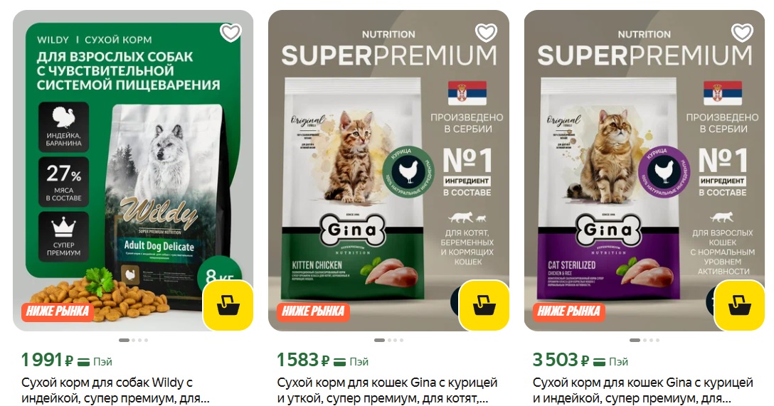 Корма для кошек и собак брендов Gina и Wildy отличаются высоким содержанием мяса, сбалансированным составом, подходят для животных с разными потребностями.