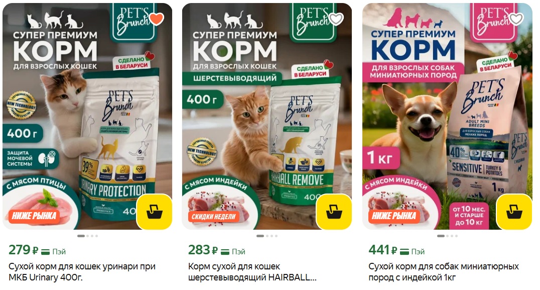 Корма сбалансированные, высокого качества, на выбор есть рационы для кошек и собак с учётом их породы, возраста и особых потребностей.