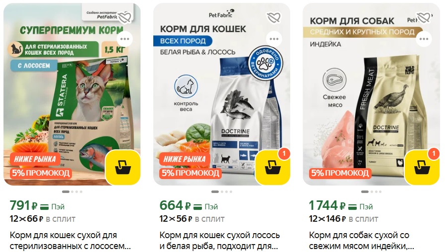 Корма высокого качества, есть варианты для питомцев с особенностями, разных пород и размеров.