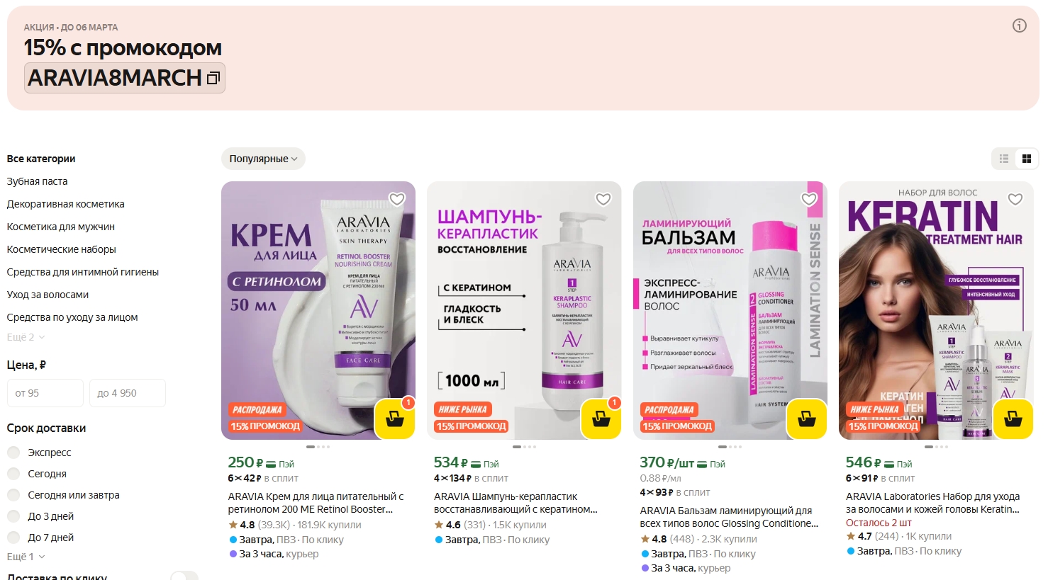 На ЯМ сейчас хорошие цены на уходовую косметику ARAVIA. По промокоду добавляется скидка 15% на выделенный каталог товаров. Цены получаются очень приятные, можно и себе взять, и подарки присмотреть.