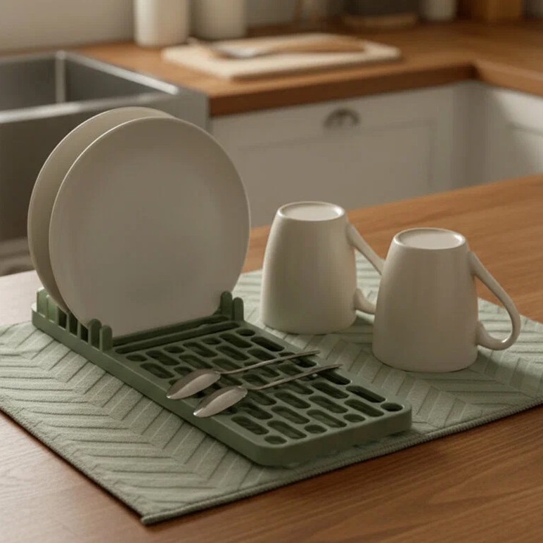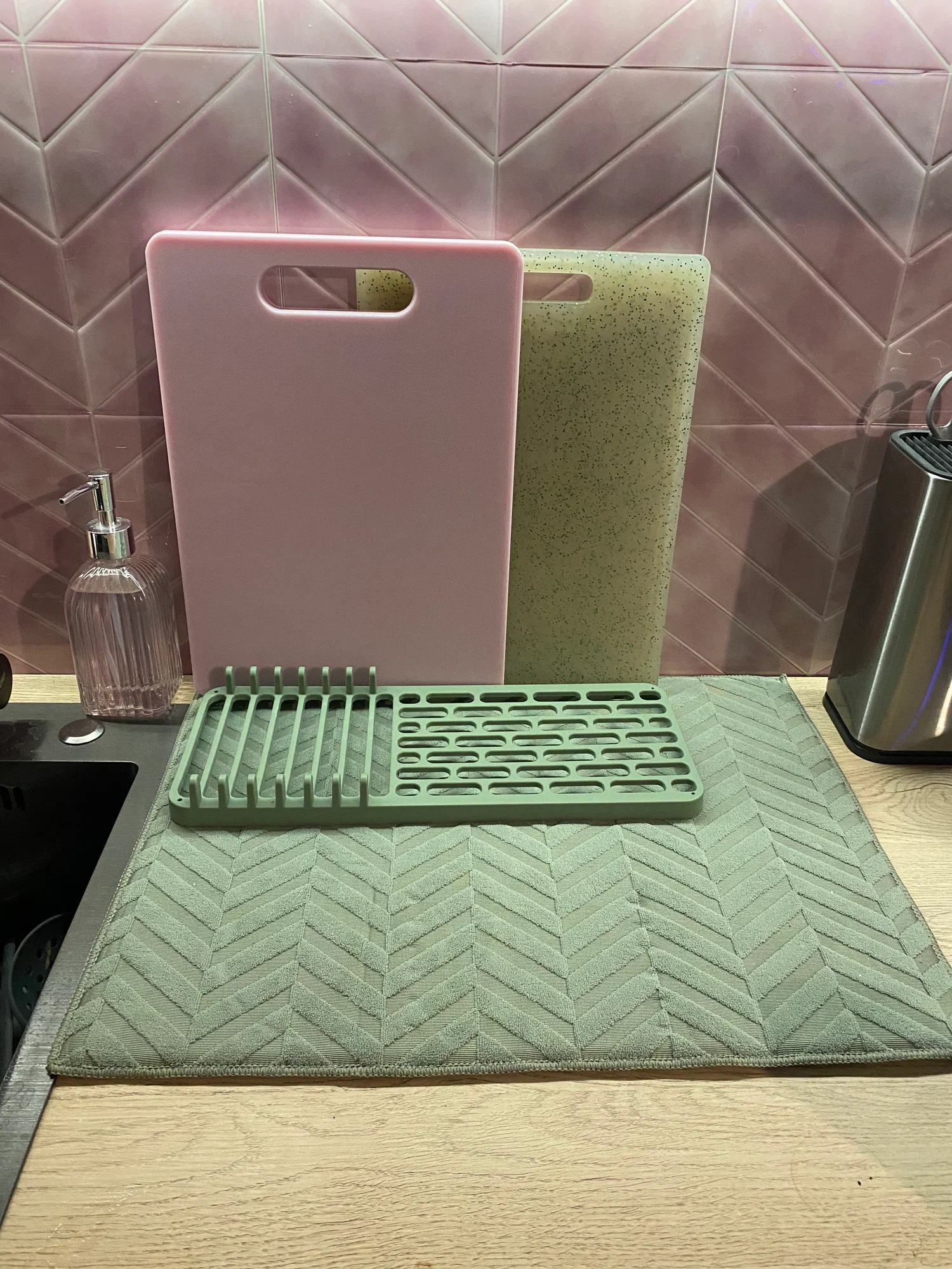 Такая цена с 100 баллами за отзыв. Симпатичный набочик оливкового цвета. Намокшую тарелку или чашку можно поставить прямо на коврик, вода не застаивается, посуда не скользит. Материал микрофибра, влагопоглощающая. Пролил воду и коврик впитывает, стол остаётся сухим. Износостойкий и простой в уходе. Можно стирать, не теряет вид.
