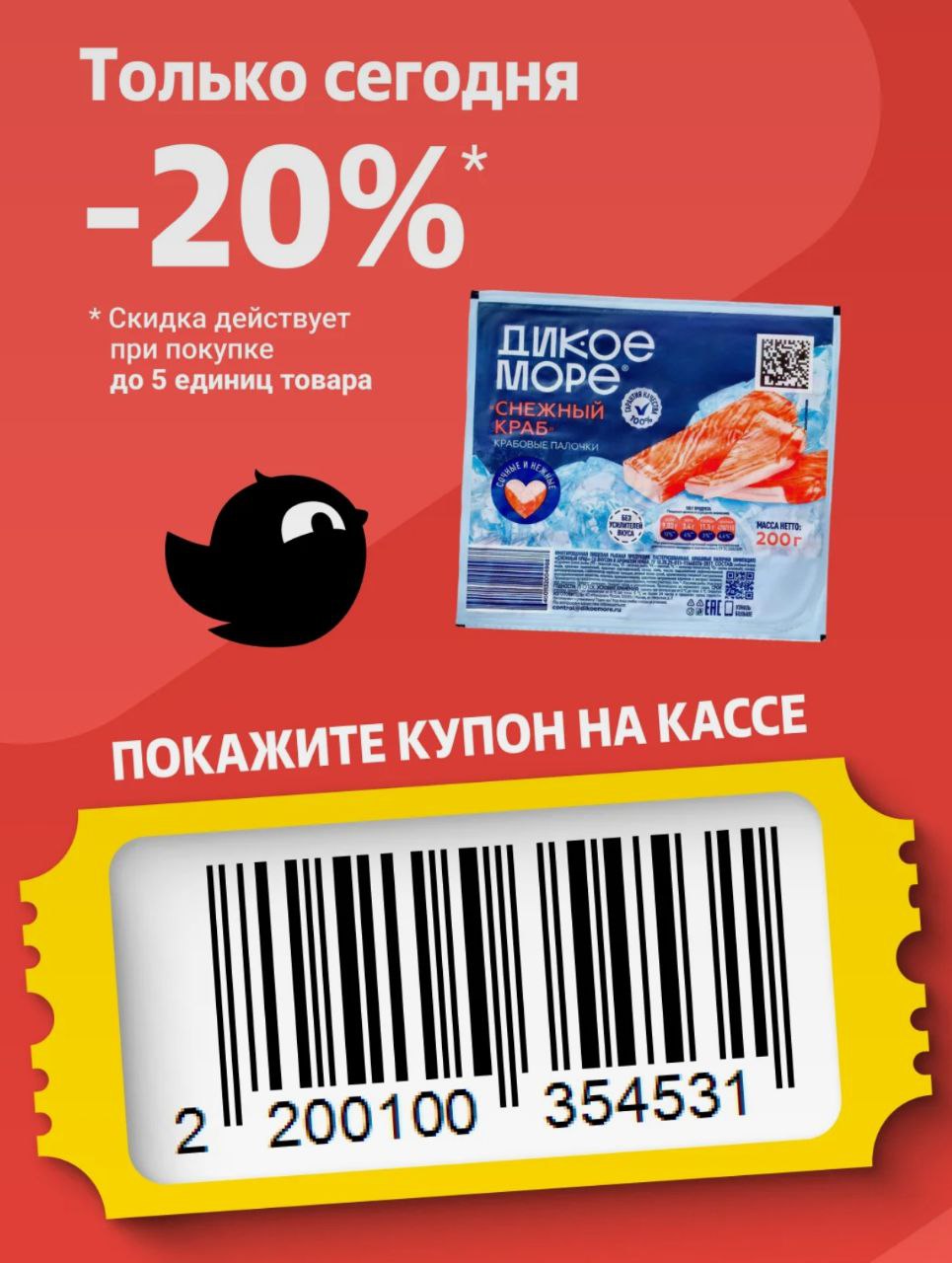 Не знаю как на вкус крабовые палочки именно этой фирмы, но обычно покупаю их только в крабовый салат, а там с майонезом любые вкусные! Со скидкой 20% у меня цена 103 руб. за 200 г. Неплохо, надо показать на кассе этот купон перед оплатой: