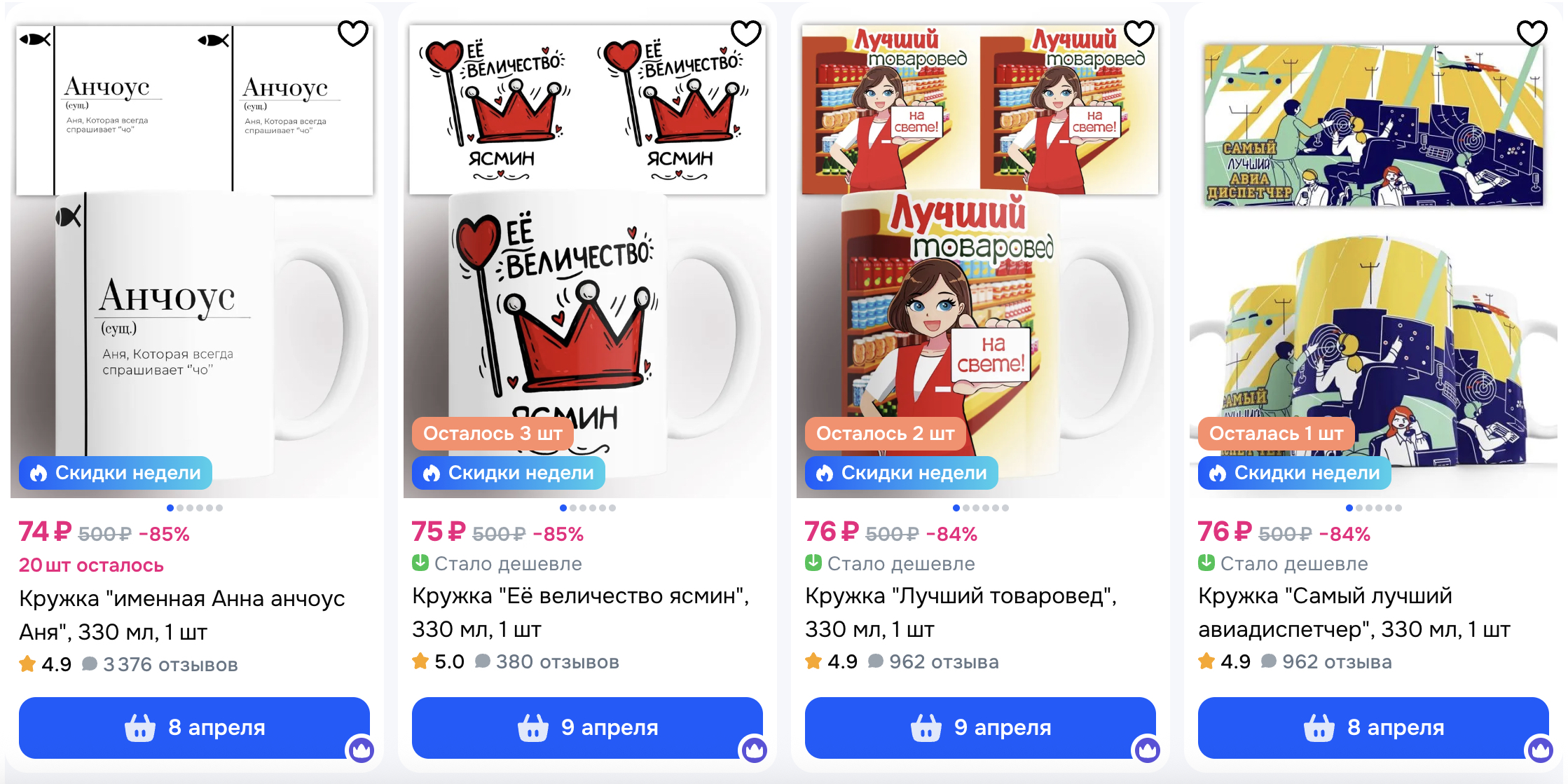 В каталоге кружки с различными принтами. Наличие "тает" на глазах. Выбирай понравившуюся.