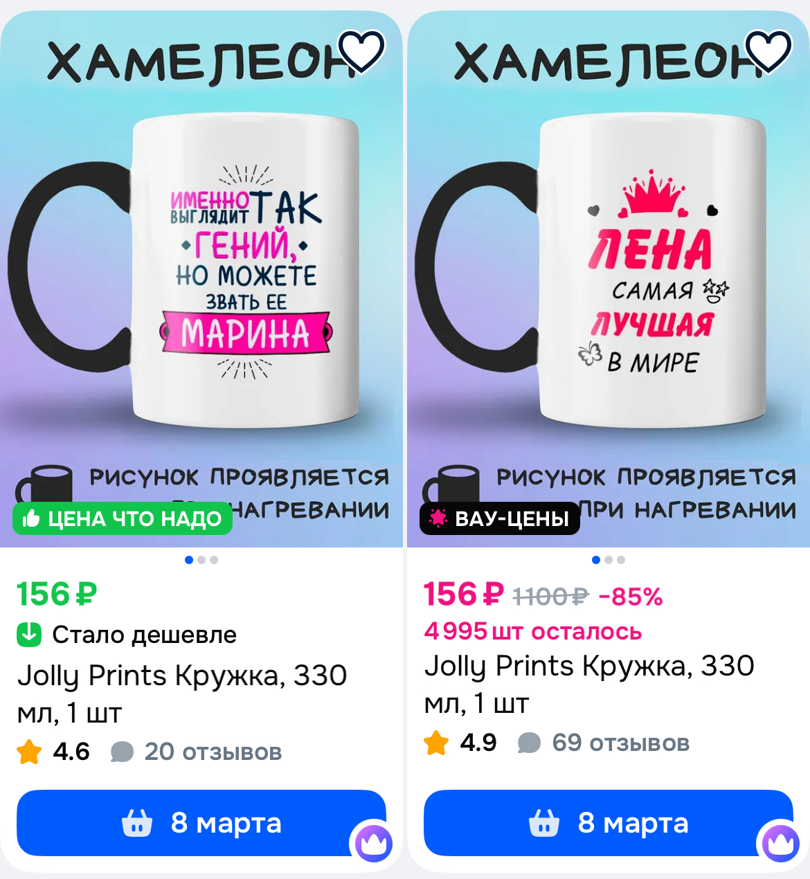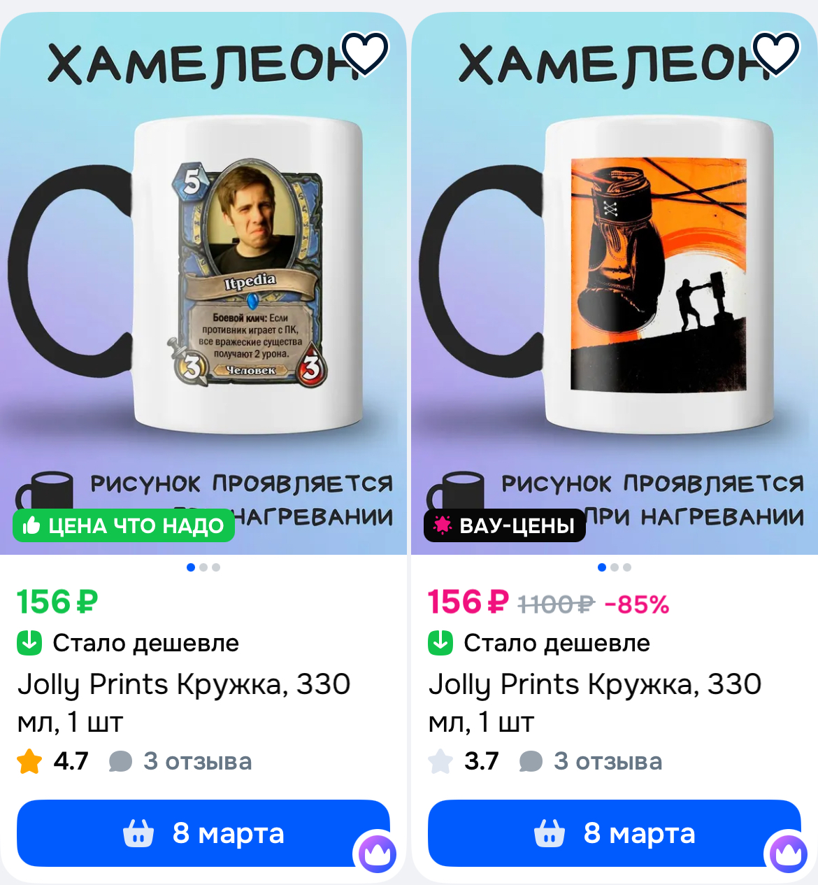 Очень забавные кружки, которые меняют цвет от температуры. Может нужны кому в качестве символического подарка. Цены вроде низкие, особо не сравнивала.