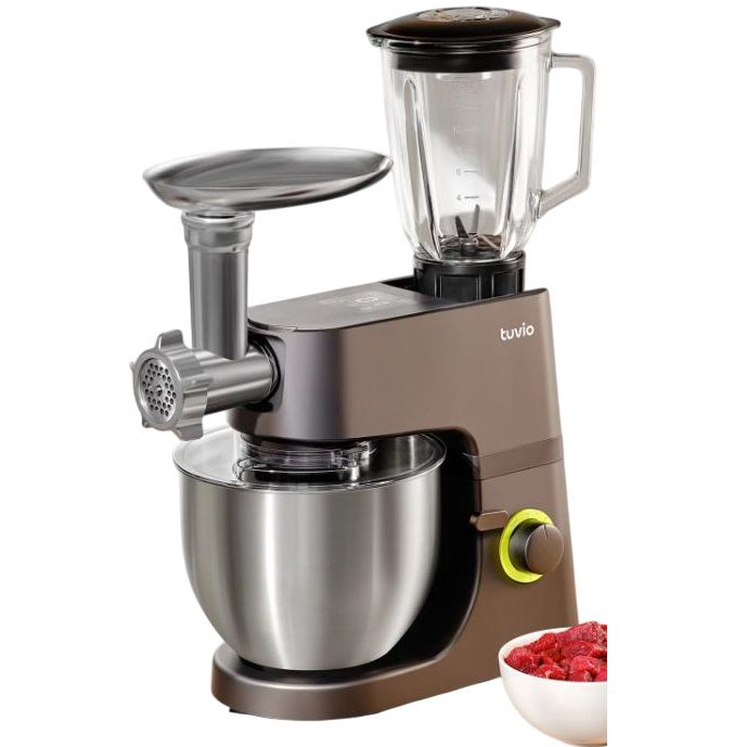 1800 Вт, LED-дисплей, 8 скоростей, планетарное вращение - всё мешает равномерно. Чаша из нержавейки 5 л с ручкой и крышкой. В комплекте мясорубка, овощерезка, блендер 1.5 л, насадки для колбасок и драников. В общем, в ней все есть и мясорубка и блэндэр и миксер.