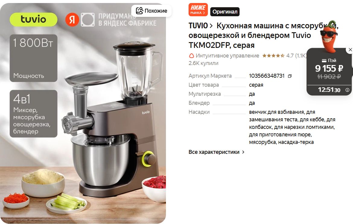 Кухонная машина за 9155₽ по карте Пэй. Там акция доржна быть - смотрите, у кого есть очень выгодно выходит. Обычно от 11992.