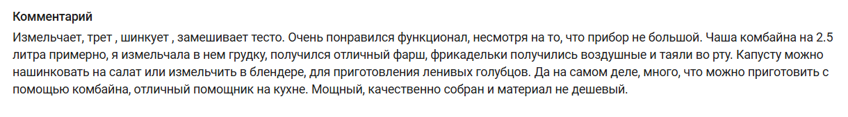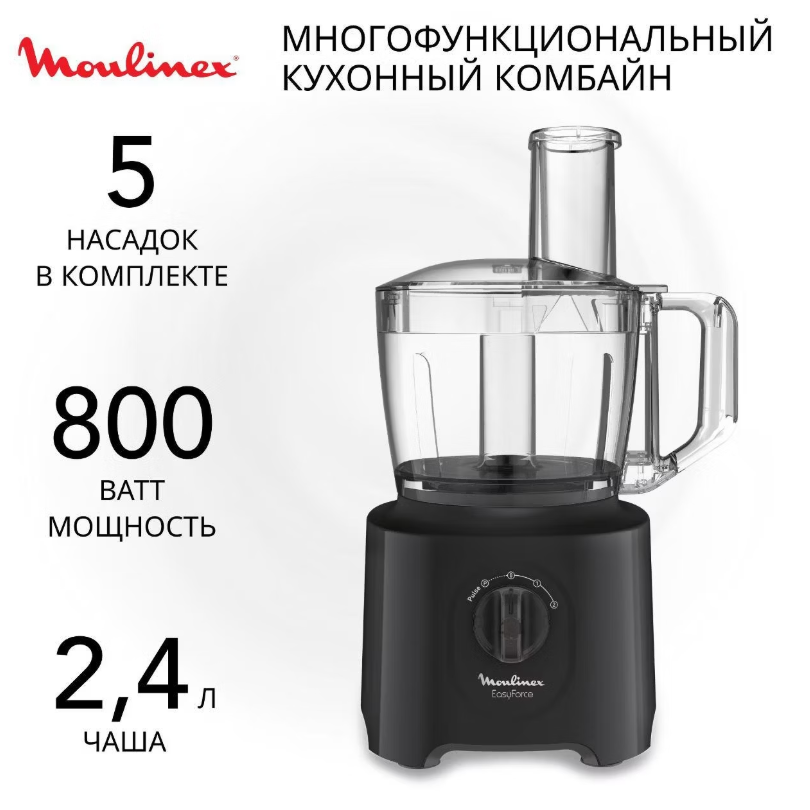 Комбайн с чашей объёмом 2,4 л и мощностью 800 Вт. Три скорости + импульсный режим. В комплекте 5 насадок: для нарезки, шинковки, натирания, измельчения и перемешивания. Поворотный переключатель, прозрачные стенки чаши, прорезиненные ножки. Есть отверстие для хранения шнура (0,8 м). Автоотключение при перегреве.