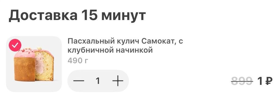 Решил сделать заказ в Самокате, а тут "халява" привалила. Кулич за 1 рубль, только надо подтвердить акцию в строке "Скидка или промокод". Скорее всего не у всех так, но я не новичок.