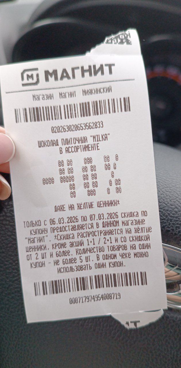 Сегодня до конца дня при покупке (обычно от 100₽) на кассе или КСО в магазинах "Магнит у дома" вместе с чеком выезжает купон -40% на Milka в ассортименте.