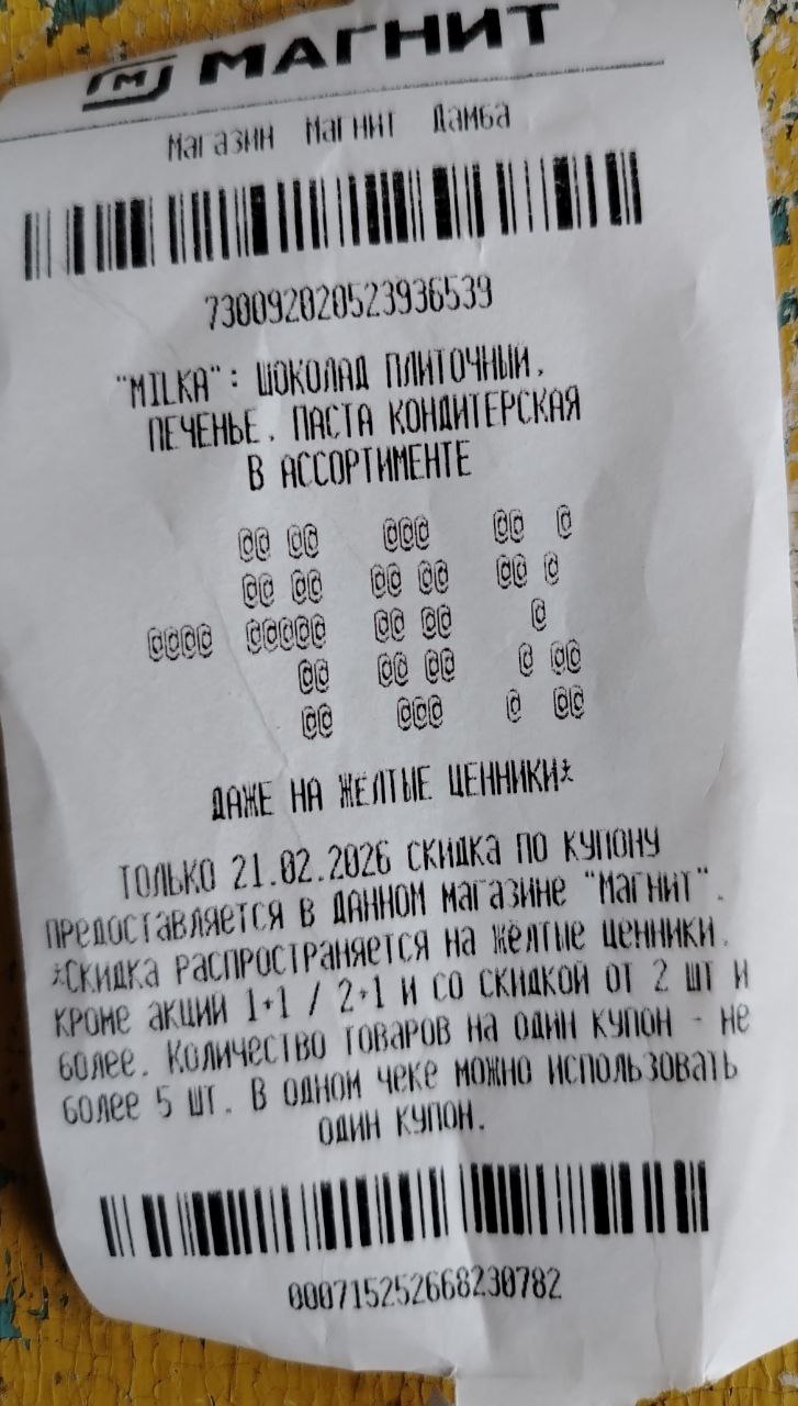 Сегодня до конца дня при покупке (обычно от 100₽) на кассе или КСО в магазинах "Магнит у дома" вместе с чеком выезжает купон -40% на Milka в ассортименте.