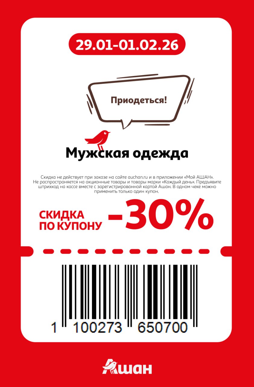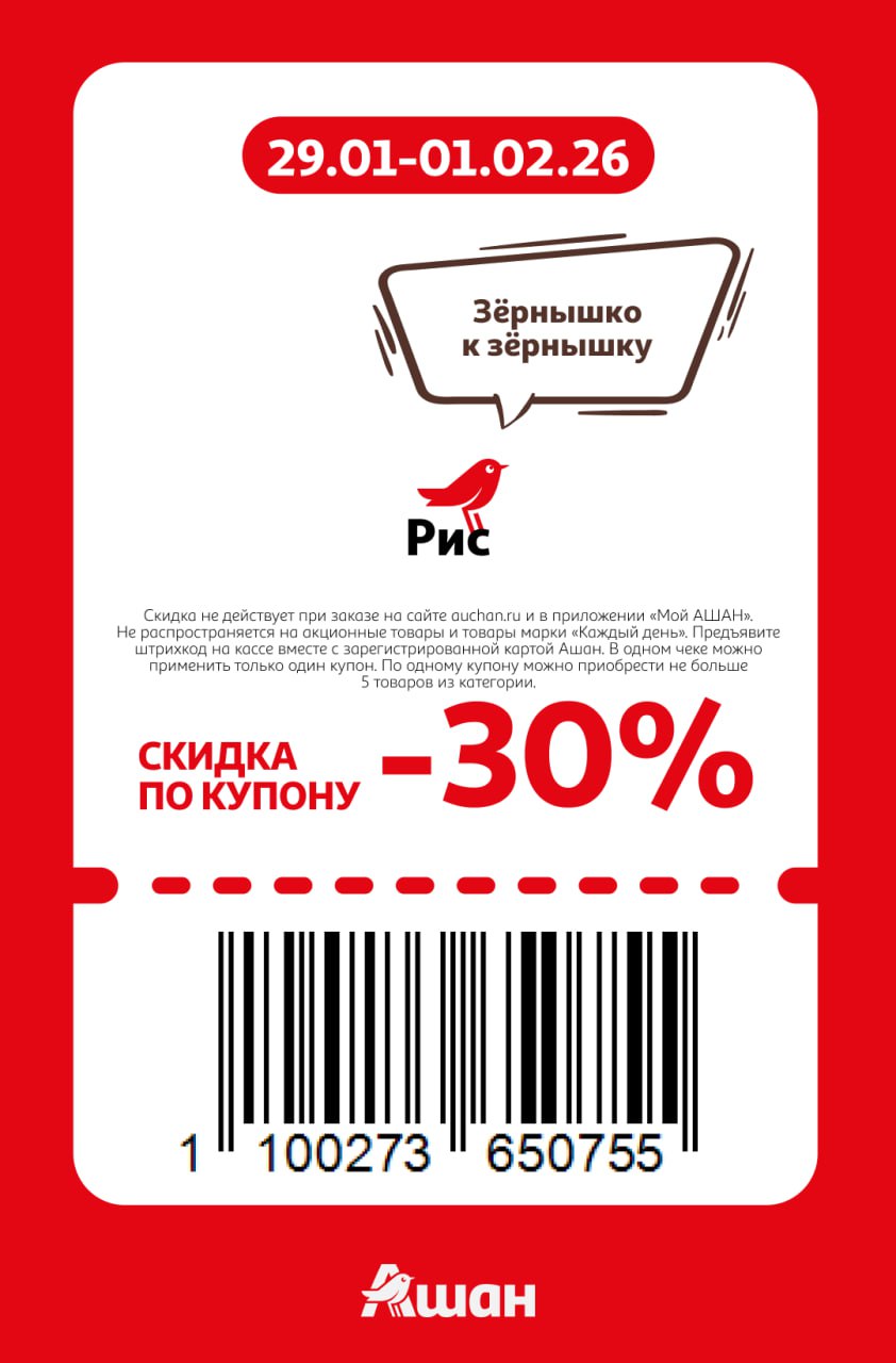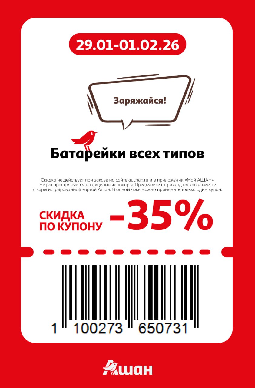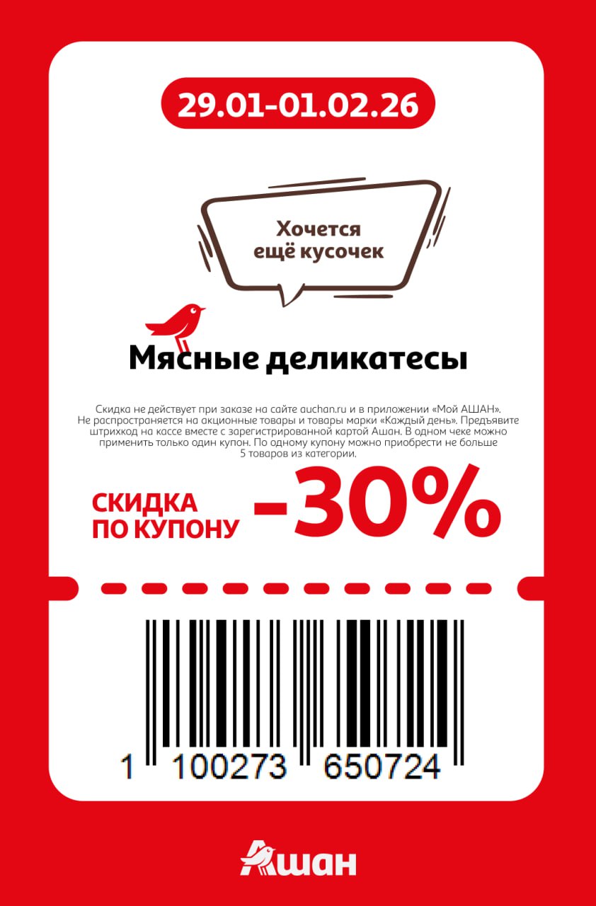 Купоны не действуют на заказы онлайн, сработают только на кассе или КСО магазинов Ашан до 1 февраля включительно. Нужно отсканировать карту Ашан и купон при оплате.
