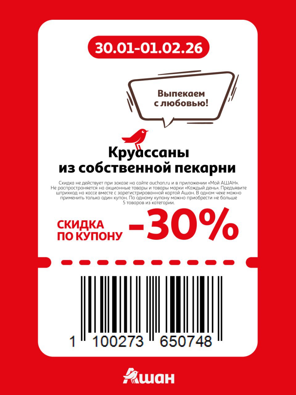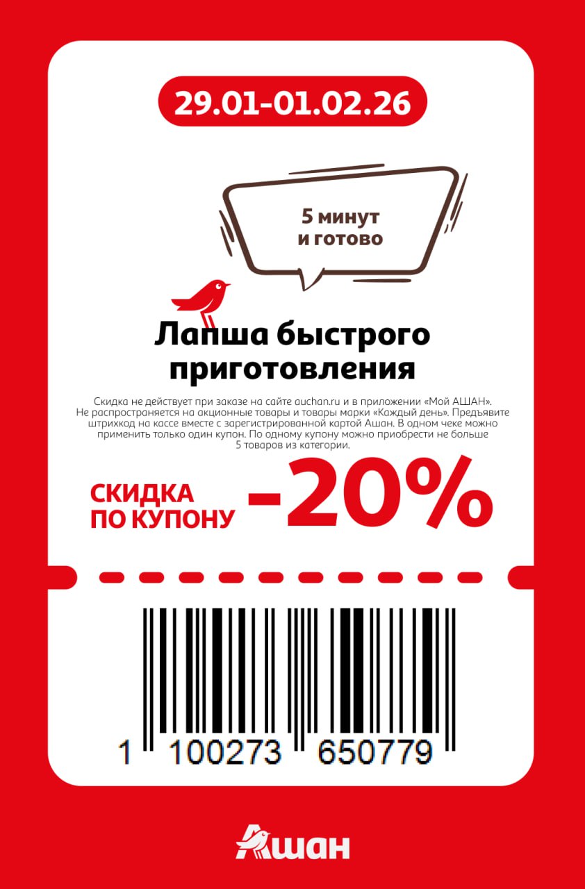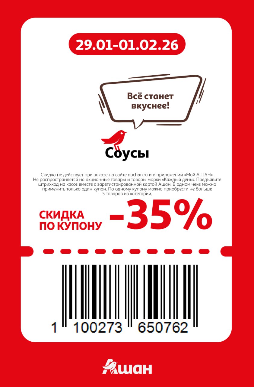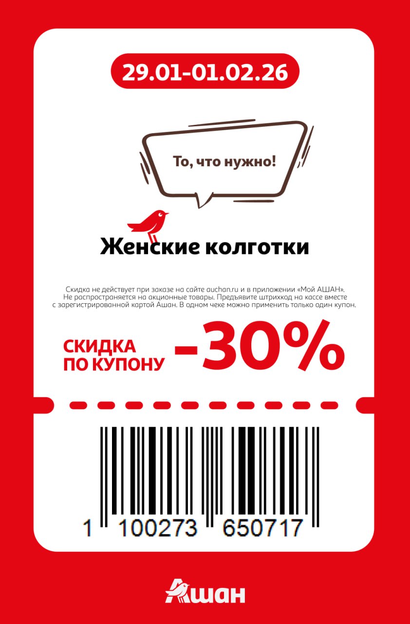 Купоны не действуют на заказы онлайн, сработают только на кассе или КСО магазинов Ашан до 1 февраля включительно. Нужно отсканировать карту Ашан и купон при оплате.