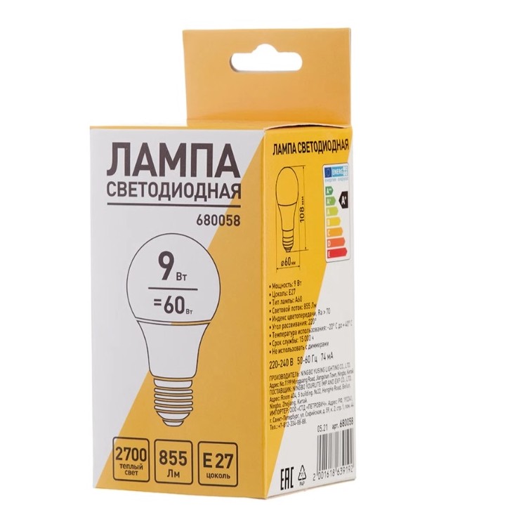 Лампа светодиодная E27 2700К 9 Вт 230 В груша А60