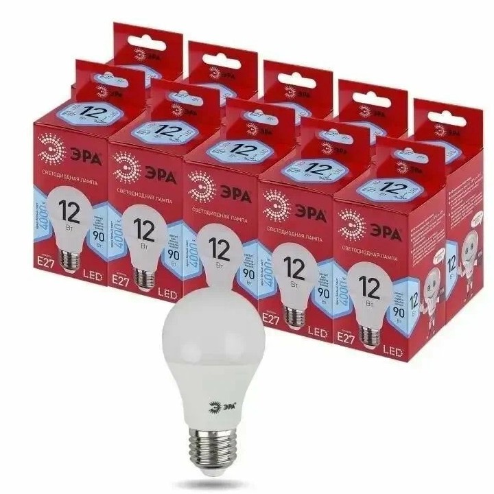 Лампочка светодиодная ЭРА LED E27 12 Вт A60 груша 4000К нейтральный белый свет набор 10 штук