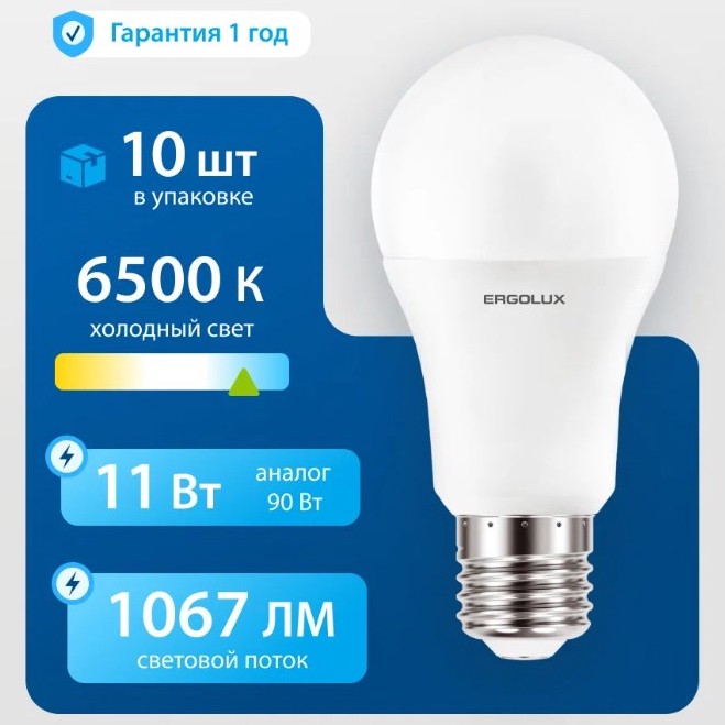 Лампочки светодиодные Е27 Ergolux ЛОН 11Вт 6500К, комплект 10 шт - 306₽ (около 30₽ за штуку)