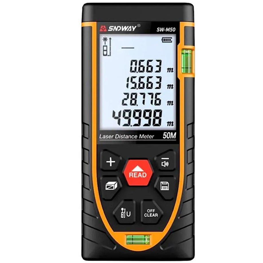 Мерит до 50 метров, точность 1.5 мм. Считает площадь, объём, Пифагор, мин/макс, непрерывные измерения. Дисплей с подсветкой, пузырьковый уровень есть. Пылевлагозащита IP54 - в ремонте не страшно. В комплекте батарейки, чехол, ремешок, отражатели.
