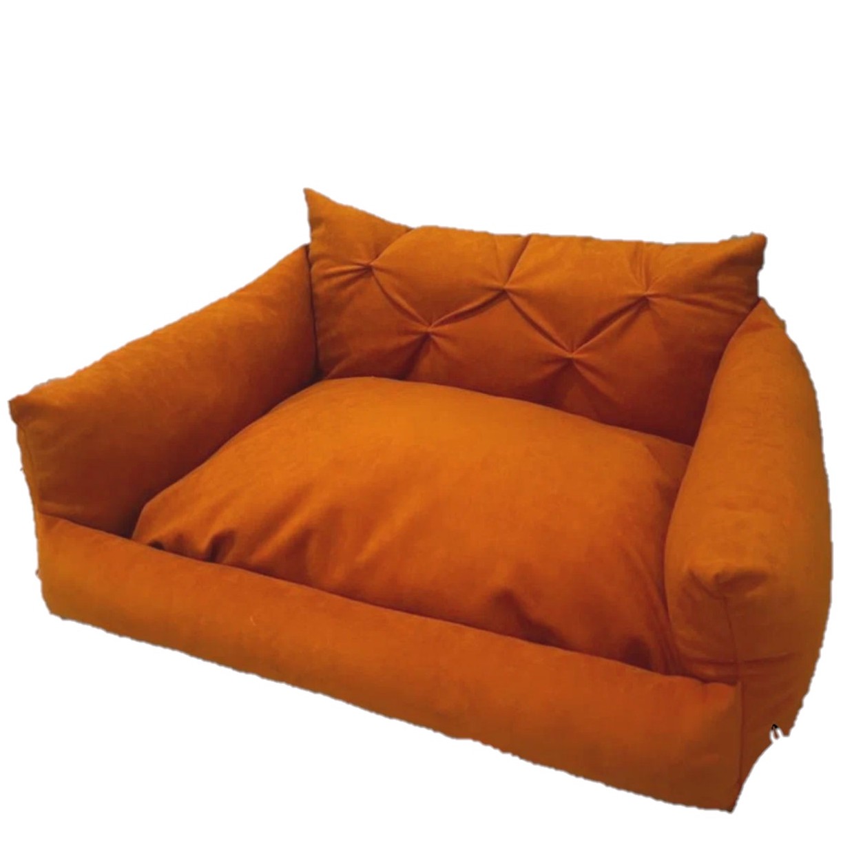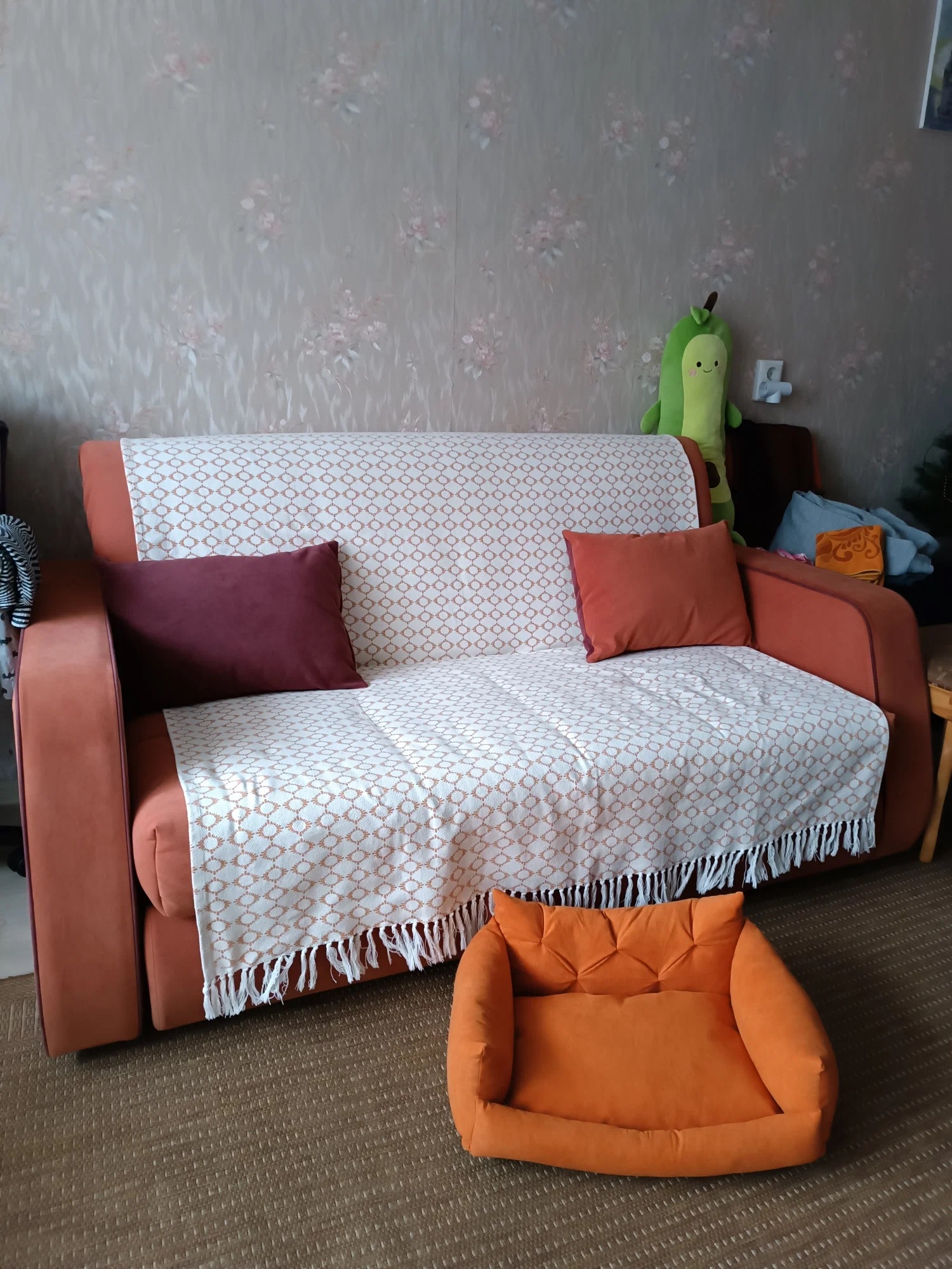 Он нереально мягкий и пухлый. Ткань плотная, приятная, швы все ровные. Не пахнет, не линяет. Дно прошито хорошо и не ерзает по полу. В стильном оранжевом цвете точно впишется в любой интерьер.Прям мини-диванчик для котейки