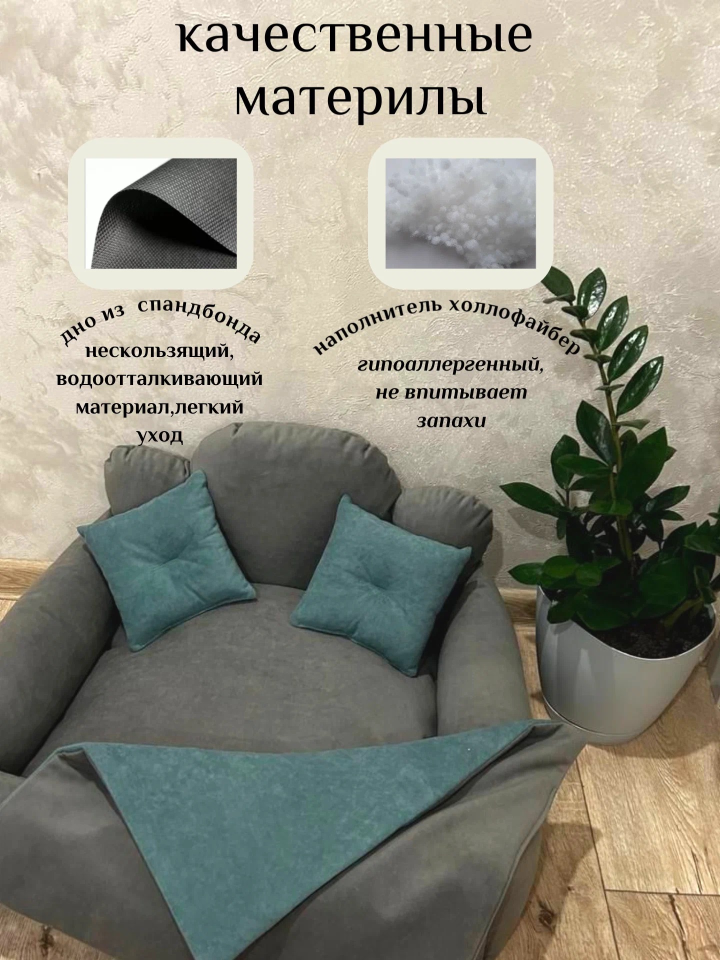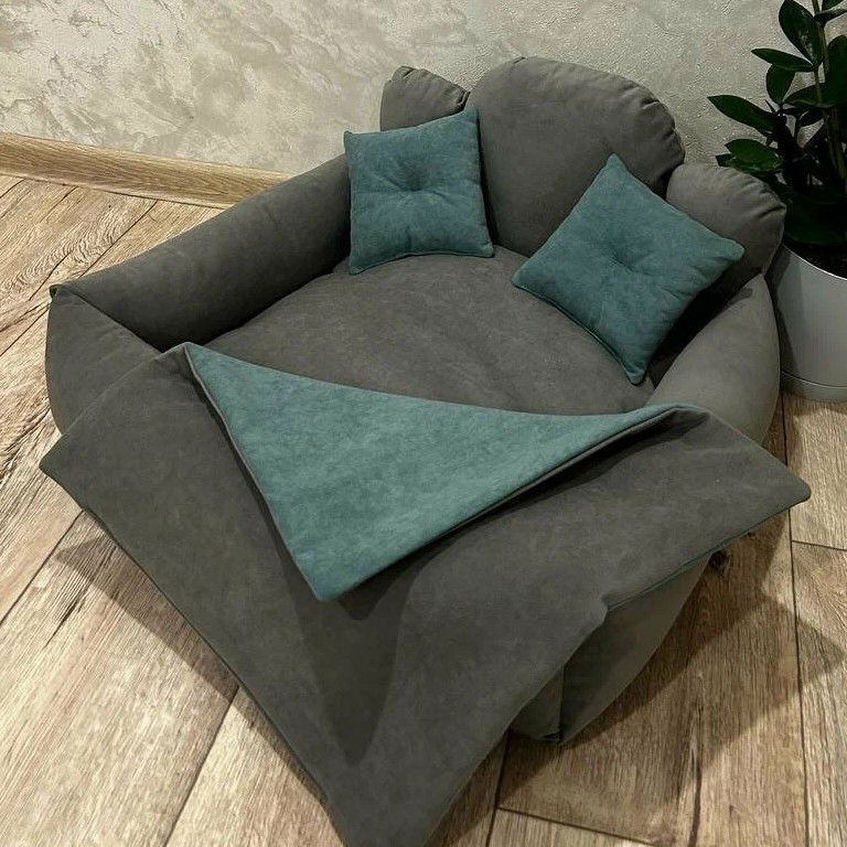 В комплекте идут плед и две подушки-игрушки. Дно прошито крепко, если животное будет мять или топтать лежак, то он не деформируется быстро. Думаю, подойдёт для кошки или небольшой собаки. Мебельный велюр быстро не устанет от стирок и ежедневного сна любим.
