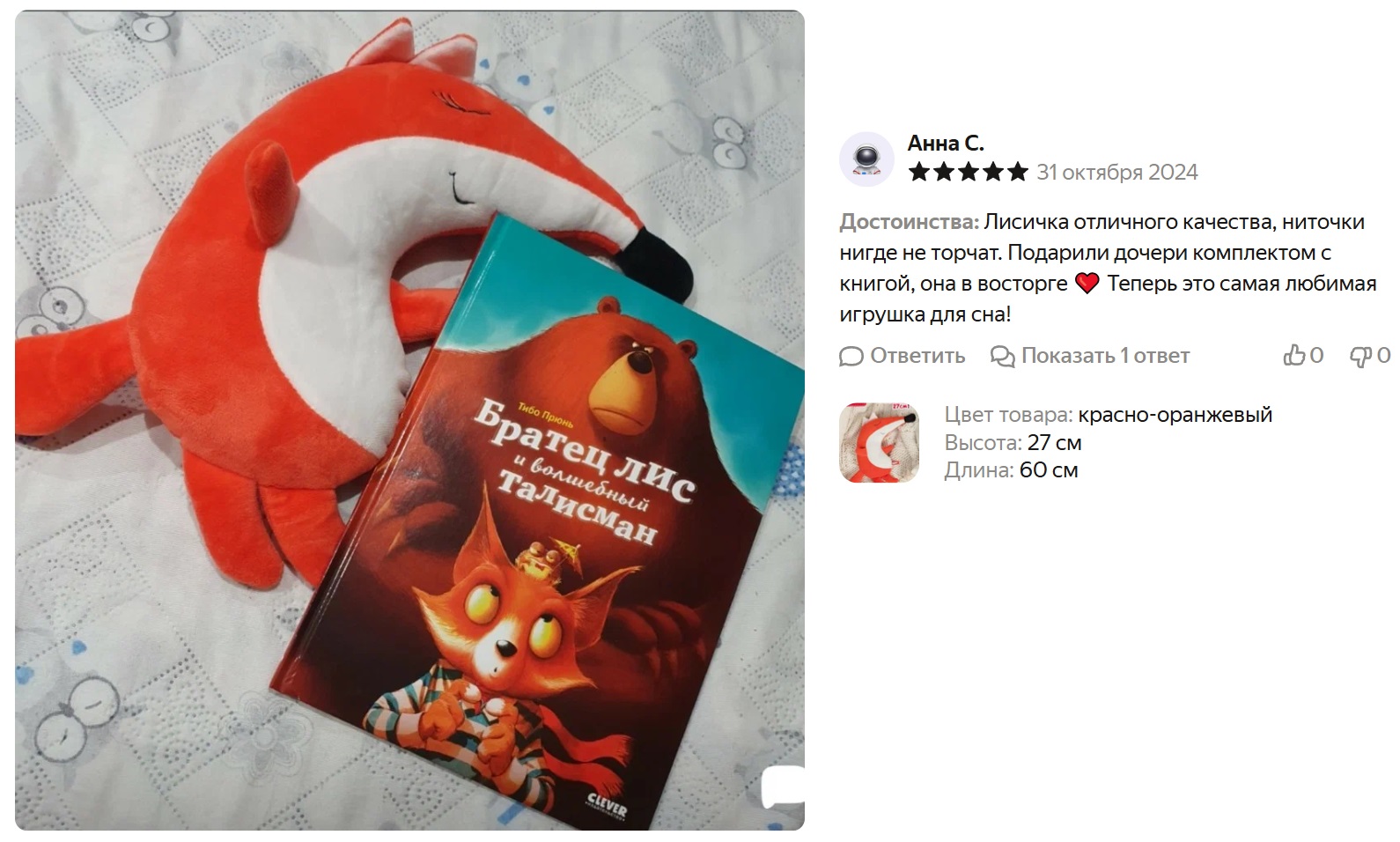Можно использовать как подушку для сна. Если ребёнок боится засыпать один или просто любит с кем-то обниматься, лиса станет отличным компаньоном. Мягкая, безопасная, без твёрдых деталей. Гипоаллергенный наполнитель и никаких мелких частей, которые можно оторвать. Для малышей до трёх лет думаю будит важным критерием.