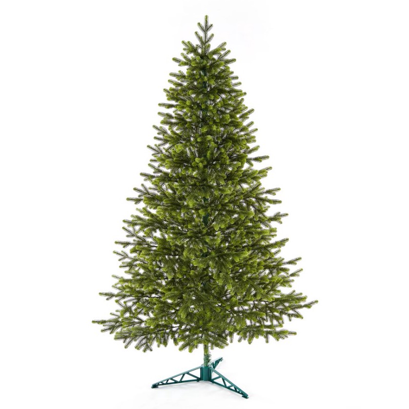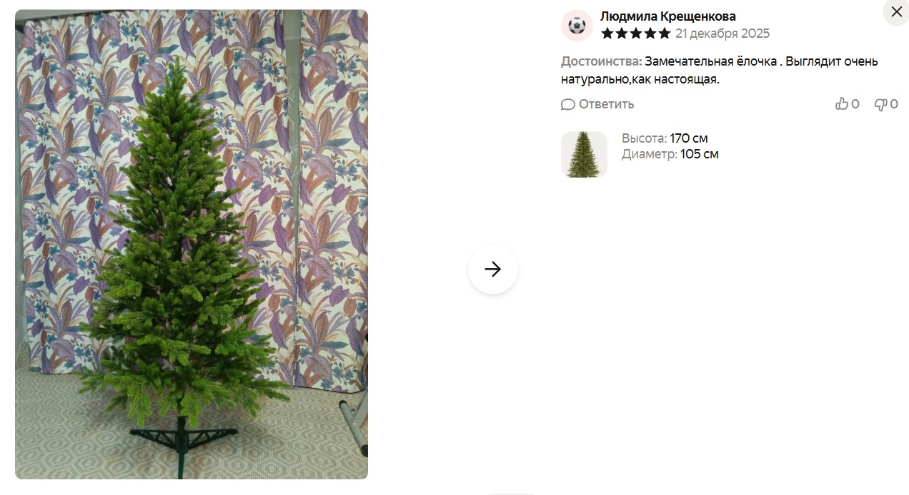 Это литая ёлка: ветки прямо как живые, с имитацией молодых побегов - выглядит дорого и натурально. Не осыплется через год, простоит долго. Диаметр 105 см, ствол разборный, ветки отгибаются для удобного хранения.