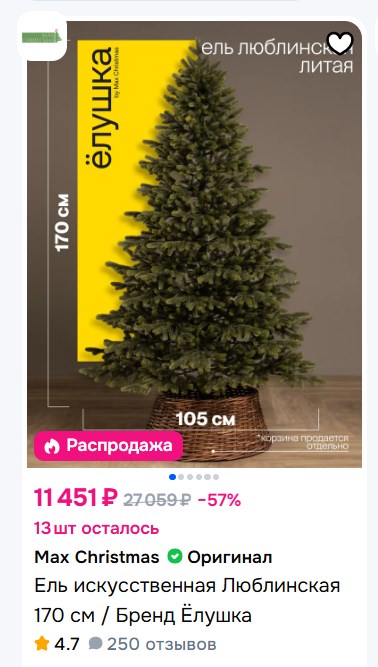Ого, вот это цена! Ель искусственная Max Christmas «Люблинская», 170 см - всего 5379₽. Обычно такие от 11 тысяч стоят, так что очень жирное предложение.