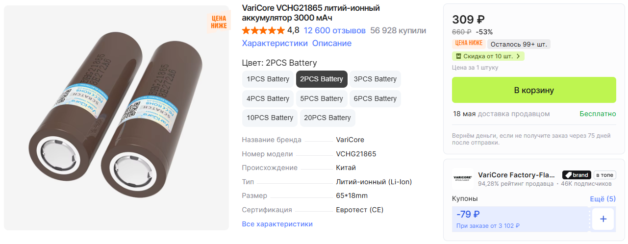 Перезаряжаемые батареи типоразмера 18650. Выдерживают 500-1000 циклов. Ёмкость 2800-3000 мАч, напряжение 3.6 В, ток разряда 20 А.