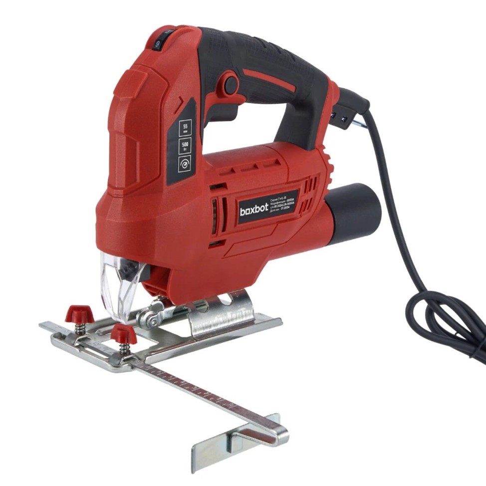 Мощность 500 Вт, частота хода 3000 об/мин с регулировкой - под любой материал: дерево (пропил до 55 мм), алюминий (20 мм), сталь (10 мм). Скобовидная рукоятка удобна для точного пиления. Подошва стальная штампованная, наклоняется до 45° - можно делать косые резы. Есть фиксация кнопки пуска (для долгой работы), возможность подключения пылесоса и параллельная направляющая для ровных пропилов. Вес 1.8 кг.