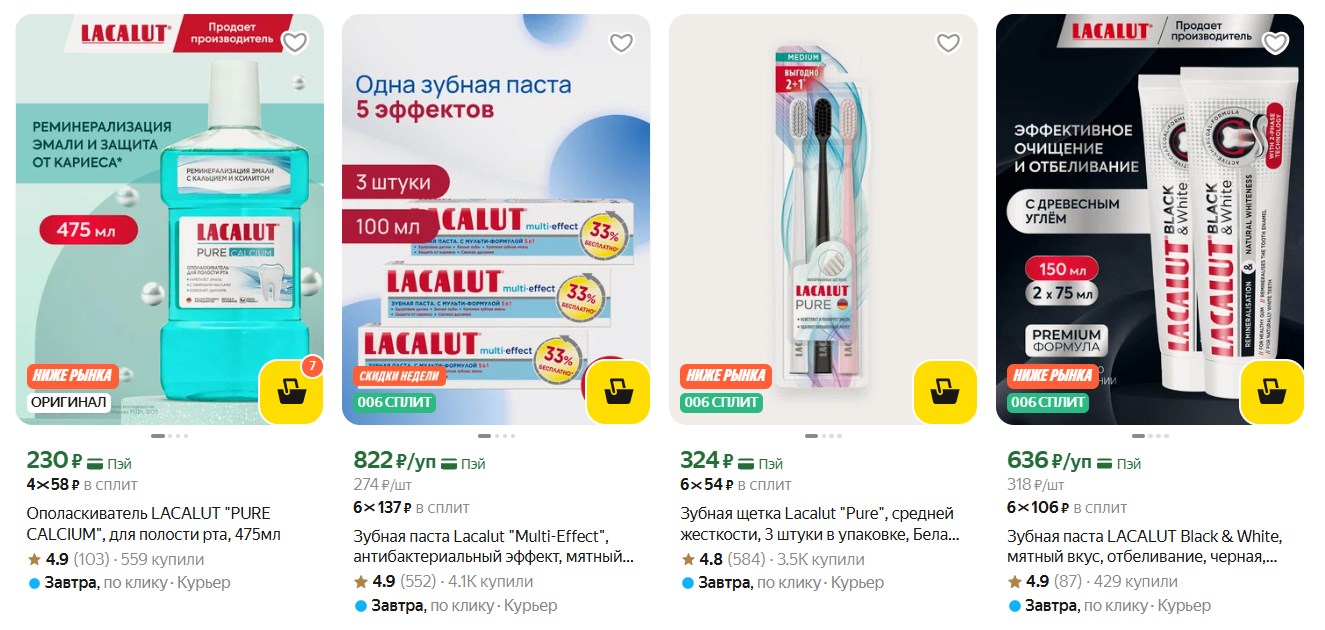Тоже присматриваюсь к уходу за зубами, нашла подборку Lacalut на Маркете. Цены вполне хорошие, можно взять сразу пару позиций.