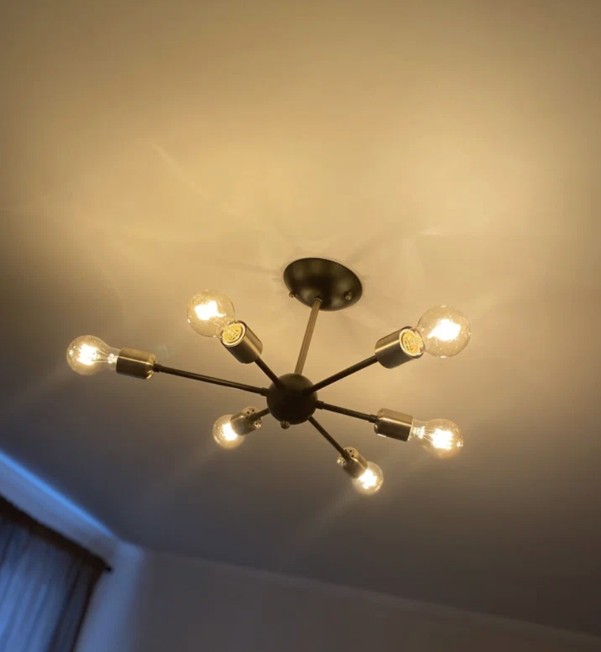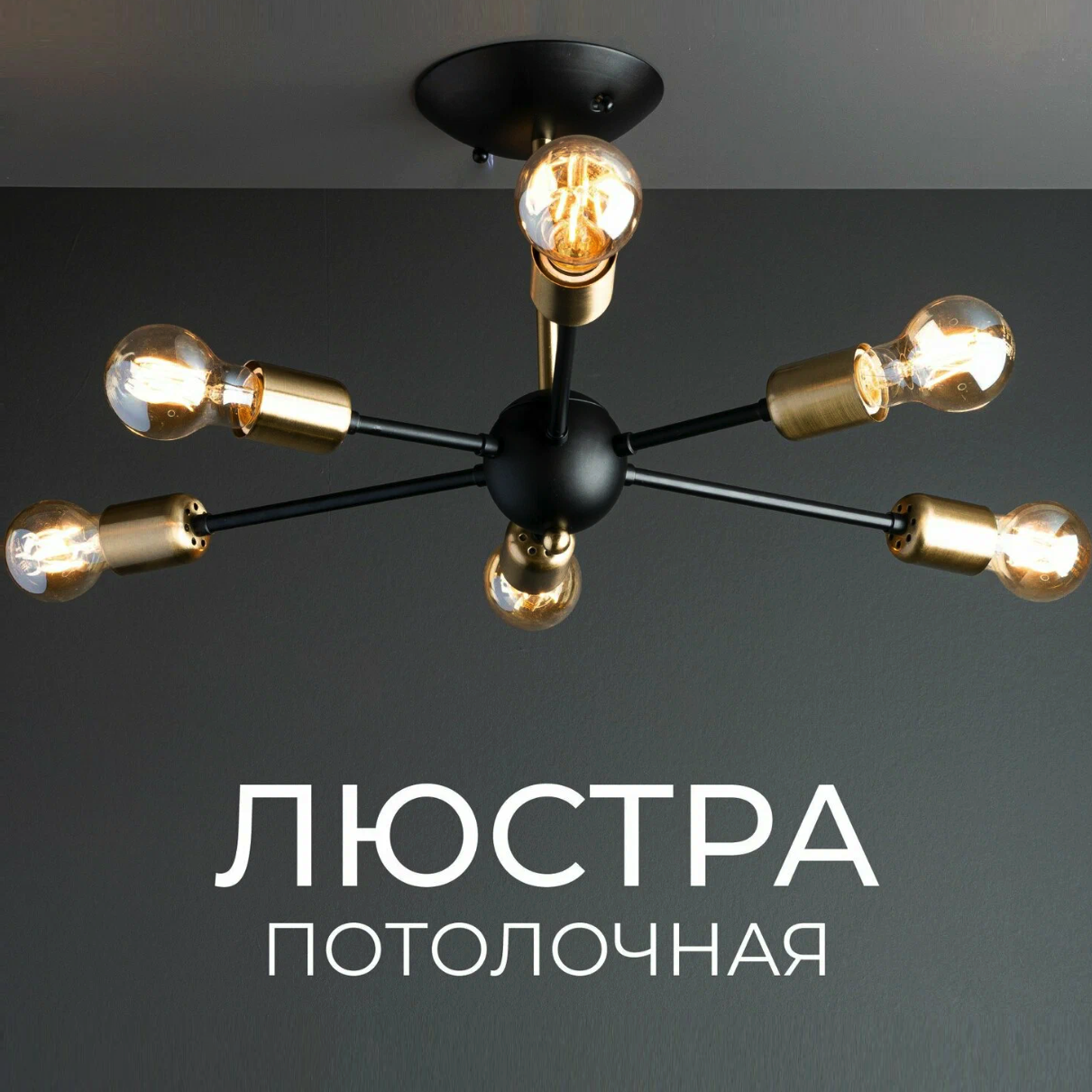 Наткнулась на стильную модель люстры-лофт: чёрный матовый металл с золотыми и бронзовыми элементами, шесть лампочек. По описанию, освещает до 18 квадратов, на комнату должно хватить.