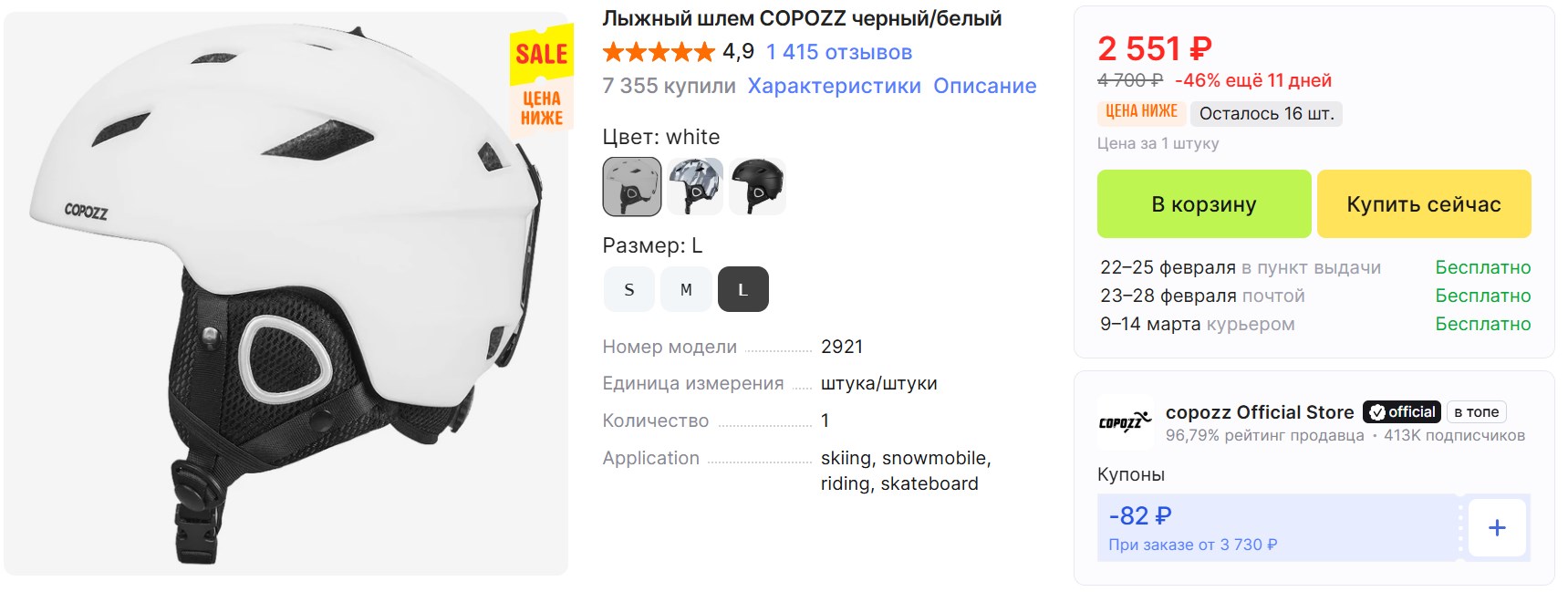 Привет. На Али лыжный шлем COPOZZ за 2551₽ - нормальная цена. Цельноформованная конструкция, сертификат CE, внутри мягкий утеплитель на ушах, размер регулируется.
