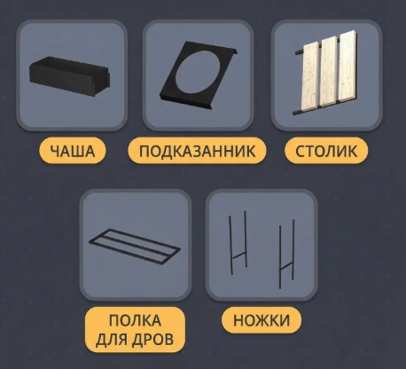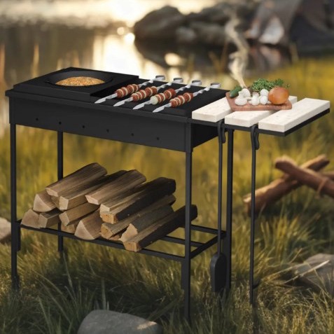 Разборная конструкция - удобно хранить в гараже или возить с собой на природу. Материал прочный, не боится погоды, плюс деревянная подставка для посуды в комплекте - можно спокойно ставить горячие кастрюли или тарелки с мясом. По сути, за полцены получаете почти всё, что нужно для выездов и дачи.