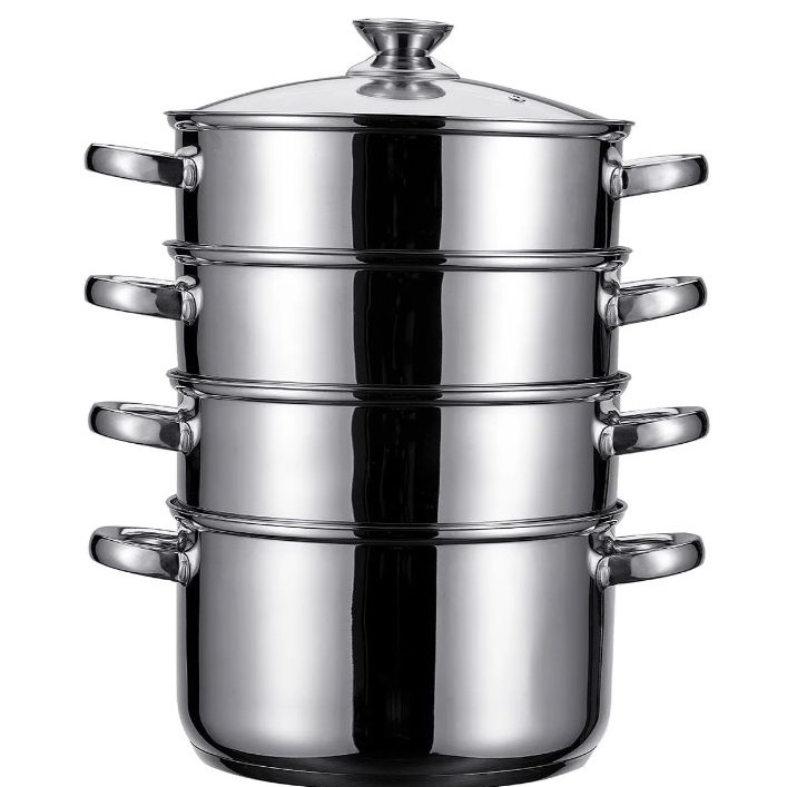 Три яруса - можно и манты, и овощи, и рыбу одновременно готовить. Нержавейка, в посудомойке моется.