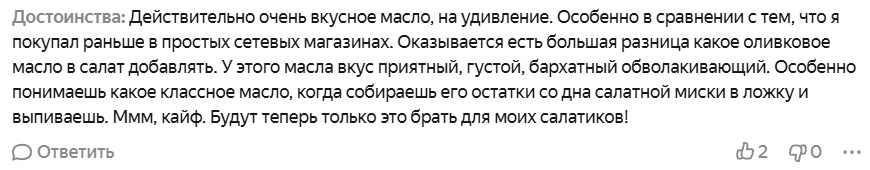 Отлично подойдёт для приготовления салатов из овощей и сыра, соусов, закусок. Не рекомендуется для жарки.