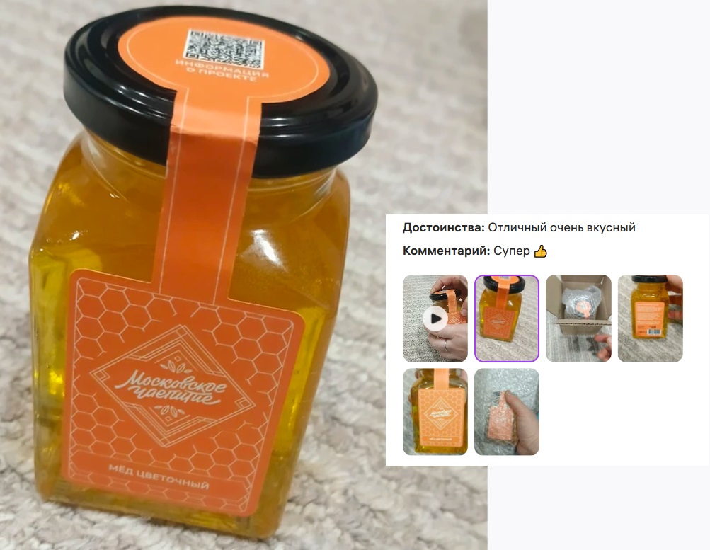 С учётом 500 баллов за отзыв выходит крутая цена за 320 г банку мёда. Собран в сезон разнотравья, не нагревался, не фильтровался до потери пользы. Цветочный, собран с разных медоносов. Вкус зависит от того, какие травы цвели в момент сбора. Со временем может засахариться (стать гуще и светлее). Это не брак, а гарантия того, что в банке не смесь глюкозно-фруктозного сиропа.