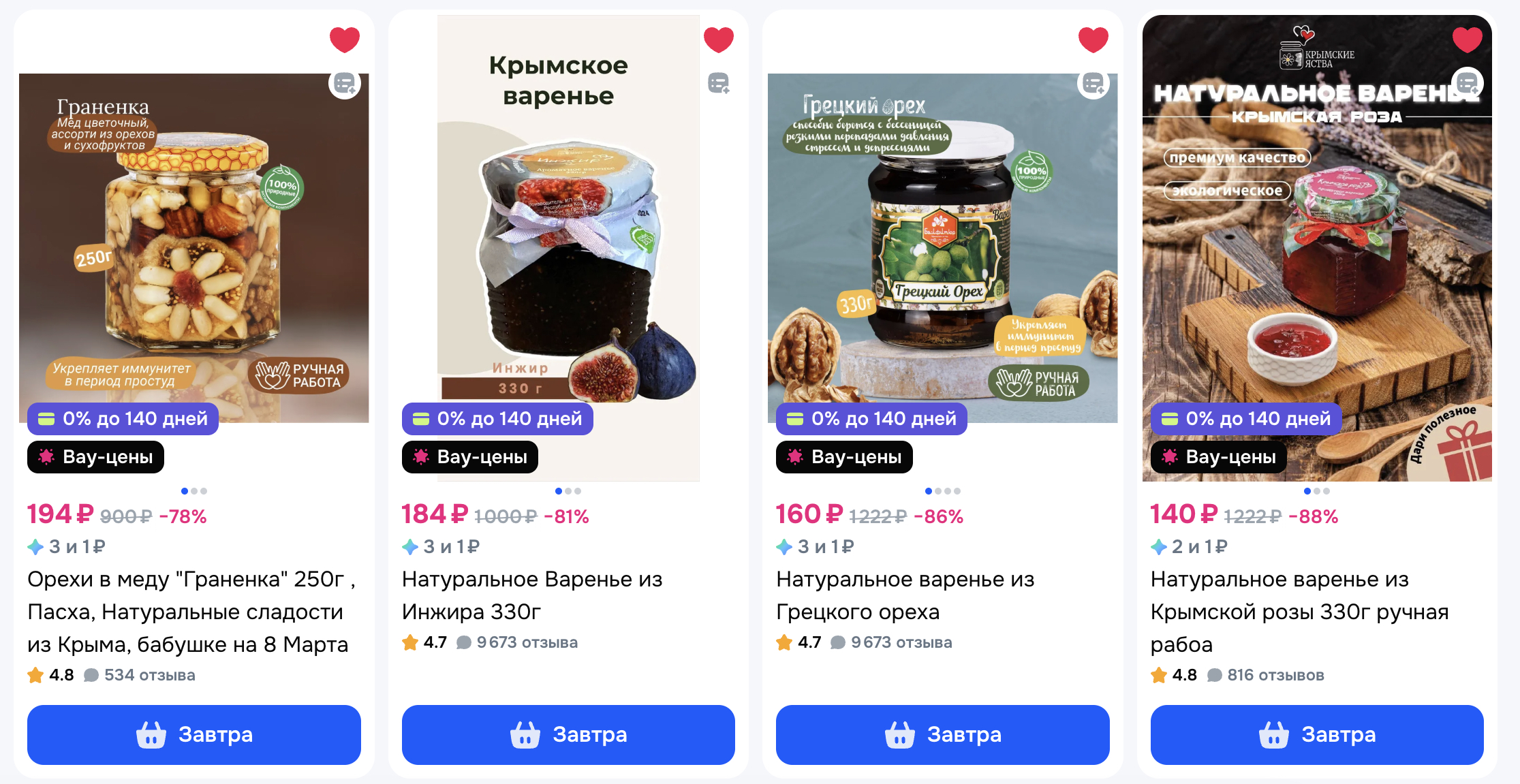 В каталоге различное варенье, орехи в меду и не только. Цены начинаются