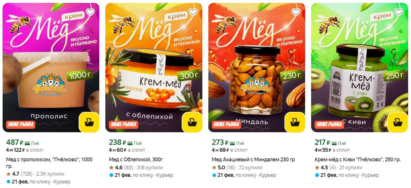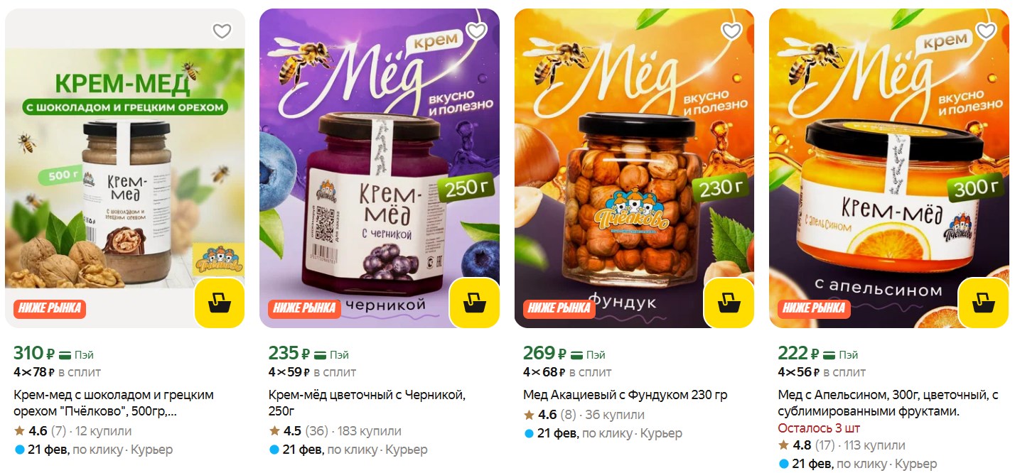 Если покупаете мёд для себя или впрок, посмотрите ассортимент «Пчёлково» на Яндекс Маркете. У них разные варианты - от классики до необычных сочетаний. Цены вполне рабочие.