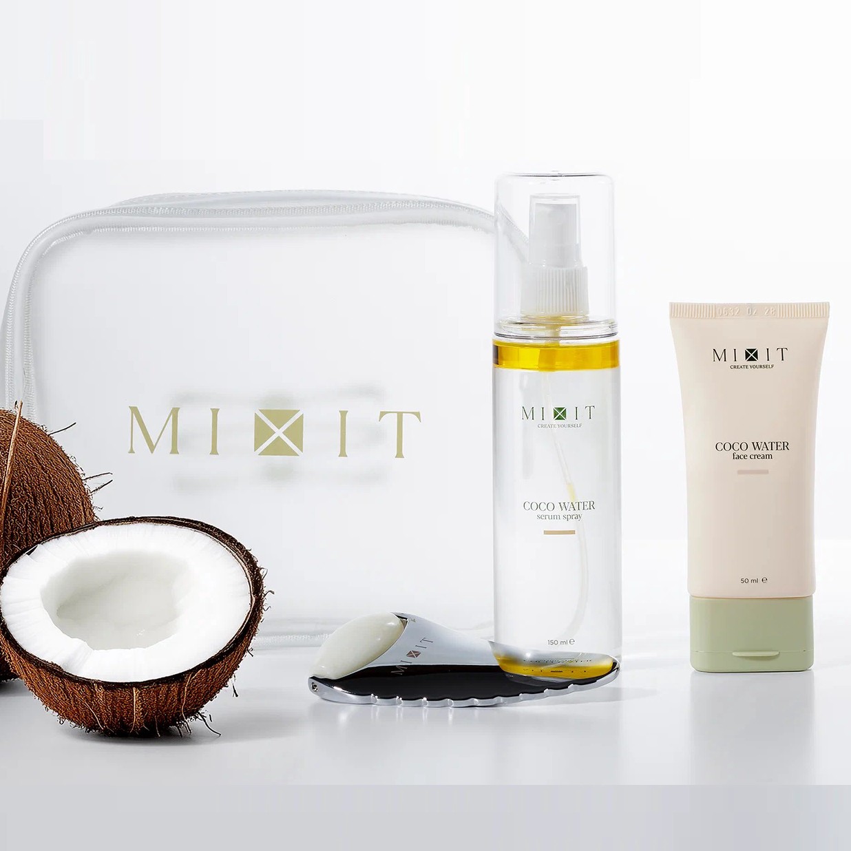 В наборе спрей и крем. Первый освежает и подготавливает кожу, второй, питает и увлажняет. Всё вместе даёт полноценный уход без лишних банок на полке. А ещё идёт роллер для моделирования овала лица. Для всех типов кожи, включая жирную, сухую и чувствительную. В составе гиалуроновая кислота (увлажнение), церамиды (восстановление барьера) и пребиотики (баланс микрофлоры).