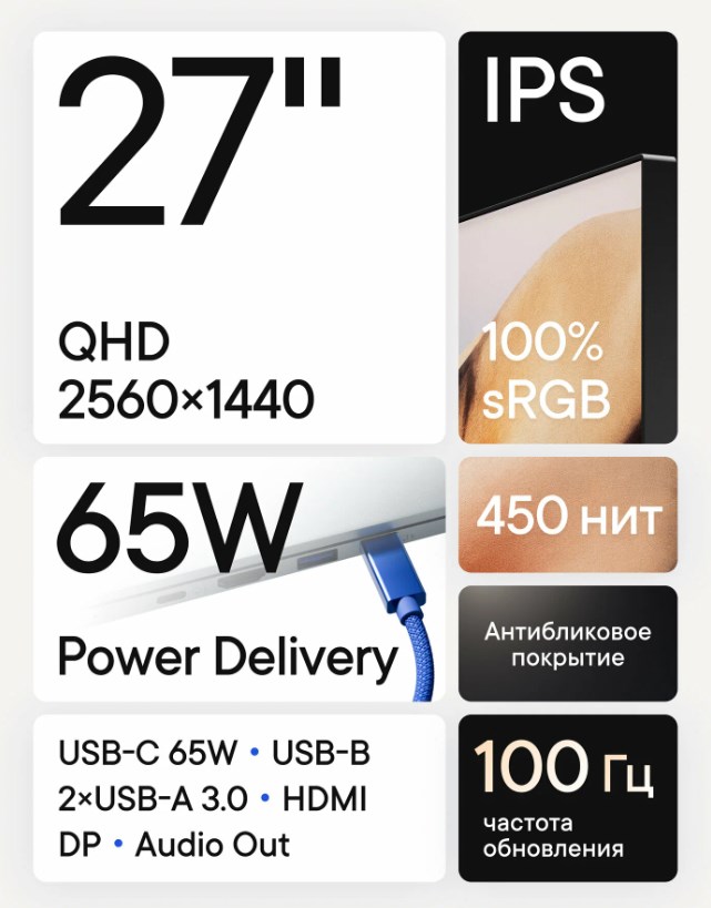 27 дюймов, 2560×1440 (2K) на IPS-матрице, 100 Гц - картинка сочная, движения плавные. Яркость 450 нит и 100% sRGB - для работы с графикой и фильмов норм, цвета без выцветания. Главный плюс - USB Type-C с Power Delivery 65 Вт: подключаешь ноутбук одним кабелем, и он заряжается и изображение передает. HDMI, DP и два USB-A есть. Регулировка по высоте, поворот на 90 градусов, VESA - как хочешь ставь.