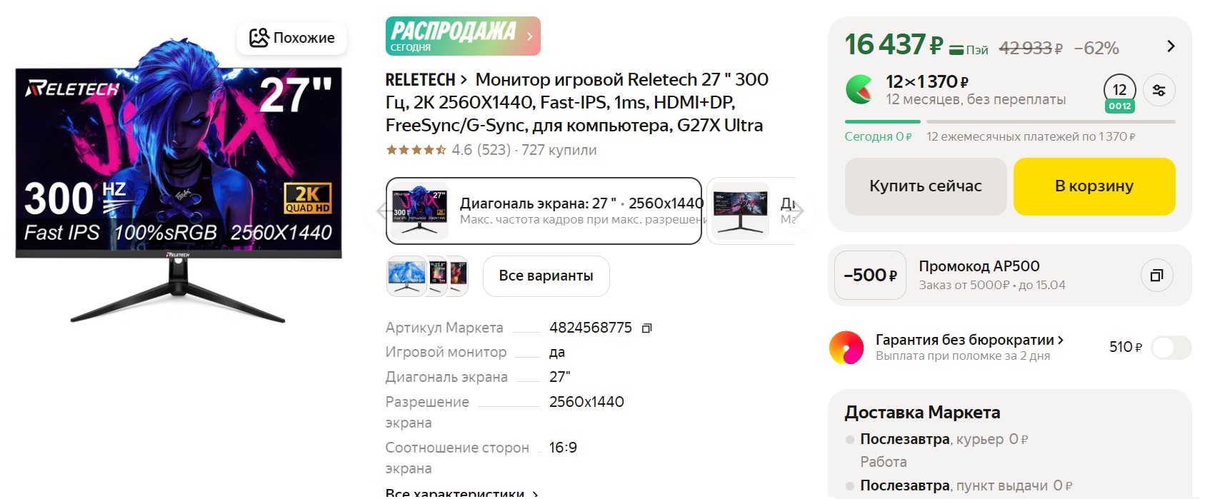 Монитор игровой Reletech 27 " 300 Гц, 2K 2560X1440 за 14937₽ с промокодом: AP1500