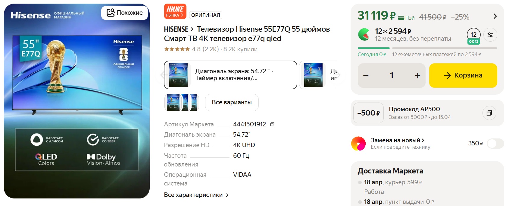 Телевизор Hisense 55E77Q за 29119₽ с промокодом AP2000