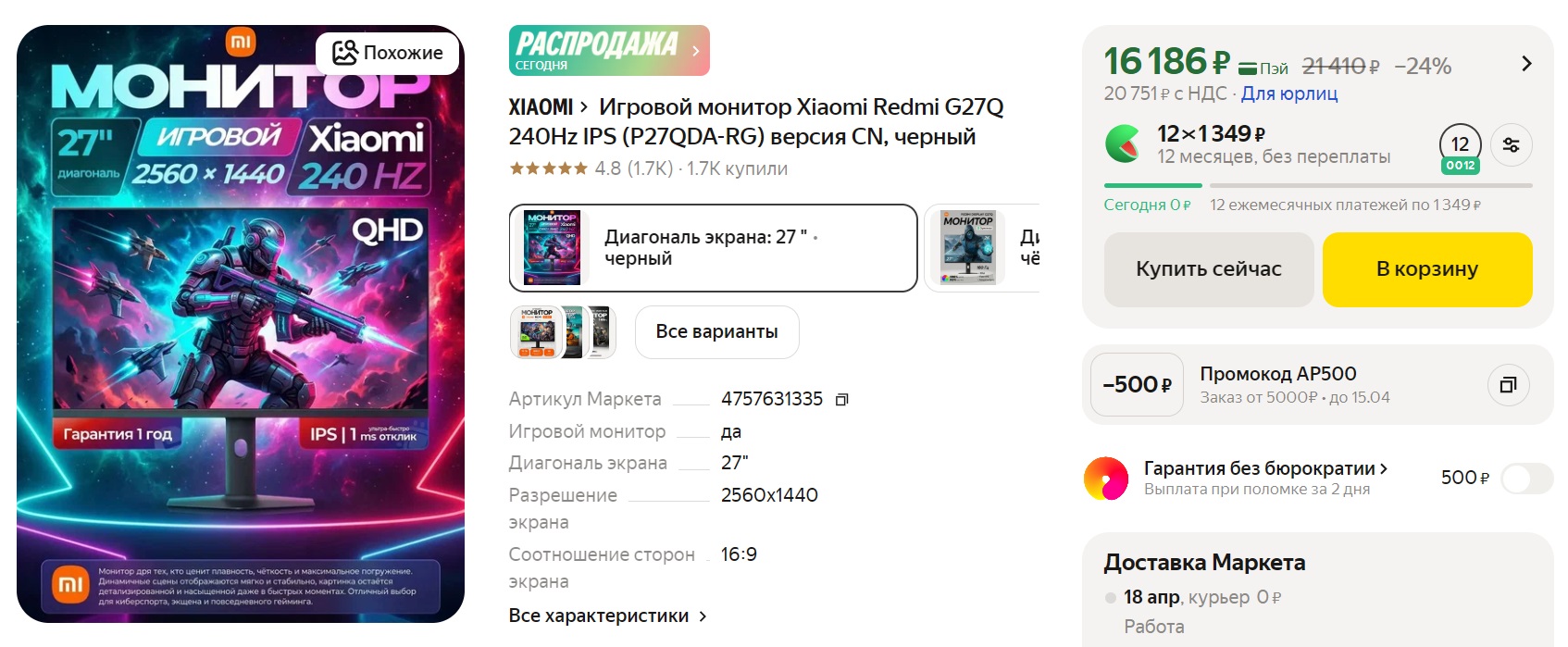 Игровой монитор Xiaomi Redmi G27Q 240Hz IPS (P27QDA-RG) за 14686₽ с промокодом: AP1500